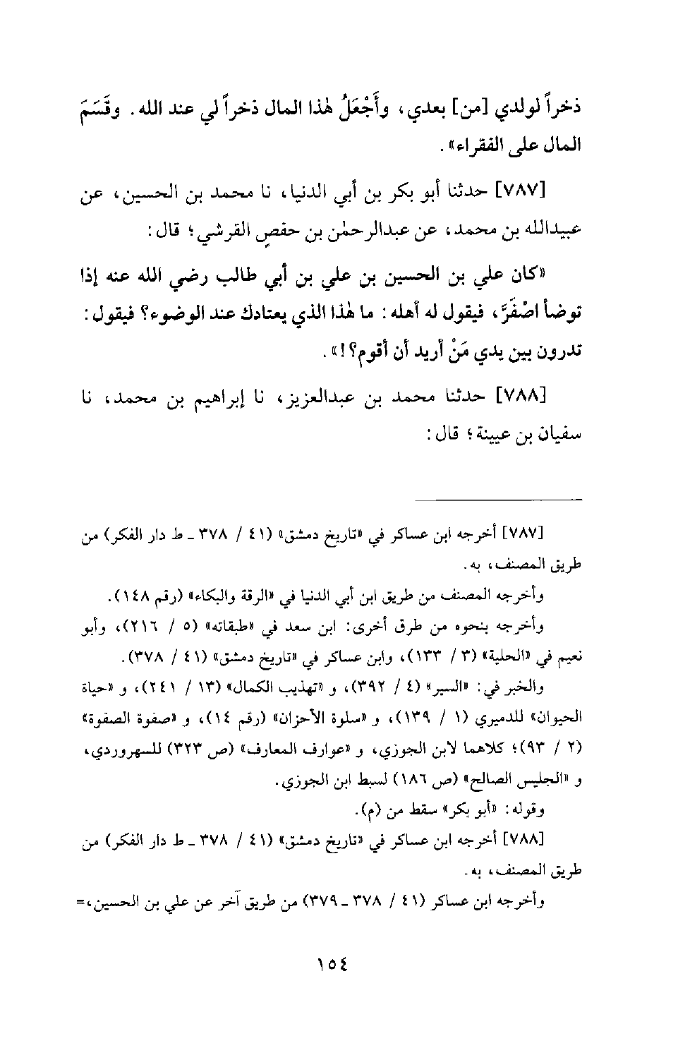 787 - حَدَّثَنَا أَبُو بَكْرِ بْنُ أَبِي الدُّنْيَا، نَا مُحَمَّدُ بْنُ الْحُسَيْنِ، عَنْ عُبَيْدِ اللهِ بْنِ مُحَمَّدٍ، عَنْ عَبْدِ الرَّحْمَنِ بْنِ حَفْصٍ الْقُرَشِيِّ؛ قَالَ: كَانَ عَلِيُّ بْنُ الْحُسَيْنِ بْنِ عَلِيِّ بْنِ أَبِي طَالِبٍ رَضِيَ اللهُ عَنْهُ إِذَا تَوَضَّأَ اصْفَرَّ، فَيَقُولَ لَهُ أَهْلُهُ: مَا هَذَا الَّذِي يَعْتَادُكَ عِنْدَ الْوُضوُءِ؟ فَيَقُولُ: تَدْرُونَ بَيْنَ يَدِي مَنْ أُرِيدُ أَنْ أَقُومَ؟ !