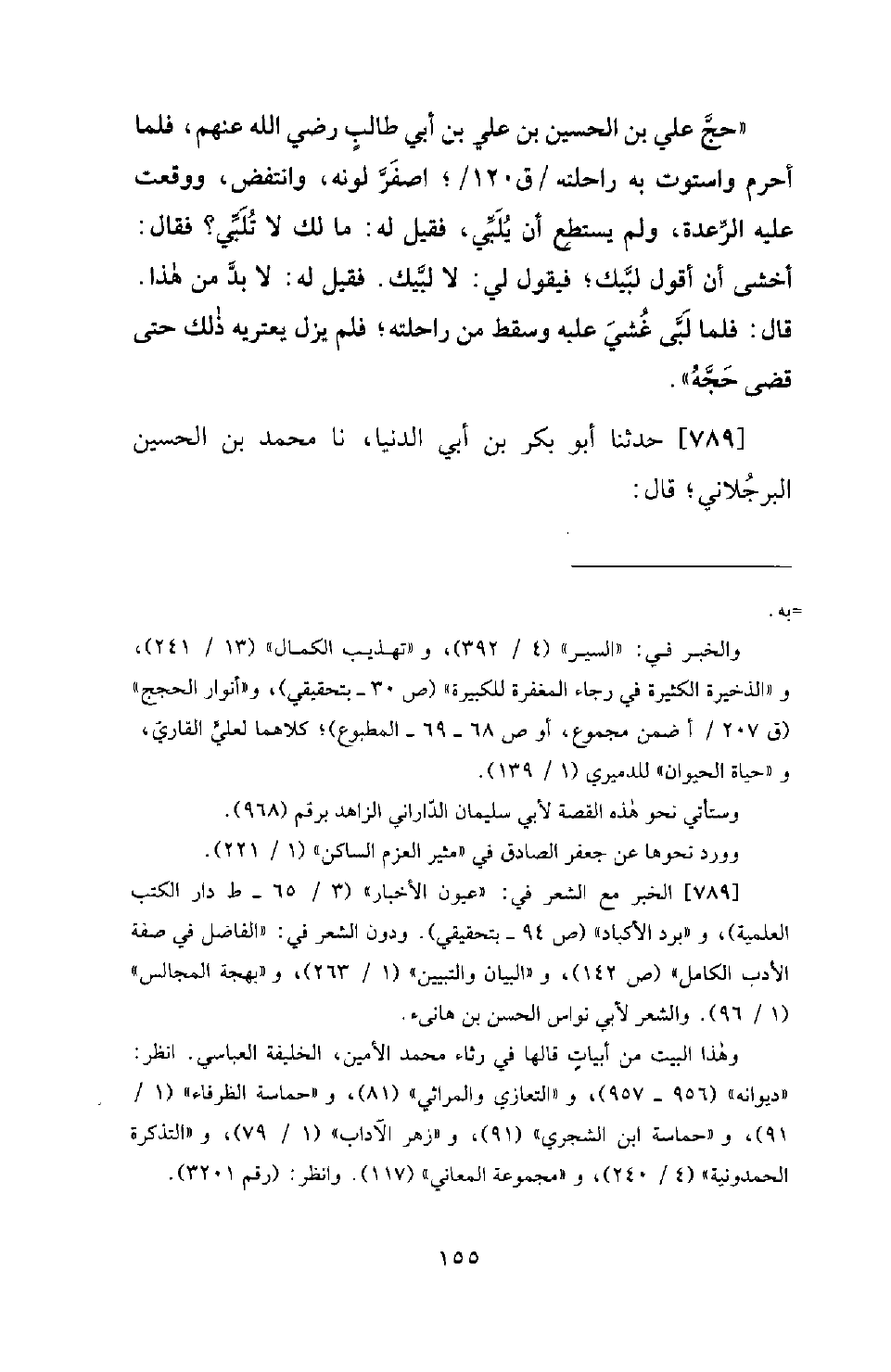 789 - حَدَّثَنَا أَبُو بَكْرِ بْنُ أَبِي الدُّنْيَا، نَا مُحَمَّدُ بْنُ الْحُسَيْنِ الْبُرْجُلَانِيُّ؛ قَالَ: -[156]- قِيلَ لِأَعْرَابِيَّةٍ مَاتَ ابْنُهَا: مَا أَحْسَنُ عَزَاءَكَ! فَقَالَتْ: إِنَّ فَقْدِي إِيَّاهُ أَمَّنَنِي مِنَ الْمُصِيبَةِ بَعْدَهُ. ثُمَّ أَنْشَدَ لِبَعْضِ الشُّعَرَاءِ فِي نَحْوِهِ: