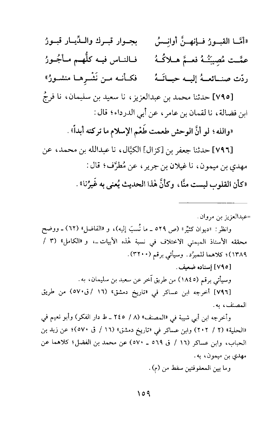 795 - حَدَّثَنَا مُحَمَّدُ بْنُ عَبْدِ الْعَزِيزِ، نَا سَعِيدُ بْنُ سُلَيْمَانَ، نَا فَرَجُ بْنُ فَضَالَةَ، نَا لُقْمَانُ بْنُ عَامِرٍ، عَنْ أَبِي الدَّرْدَاءِ؛ قَالَ: وَاللهِ! لَوْ أَنَّ الْوَحْشَ طَعِمَتْ طَعْمَ الْإِسْلَامَ مَا تَرَكَتْهُ أَبَدًا