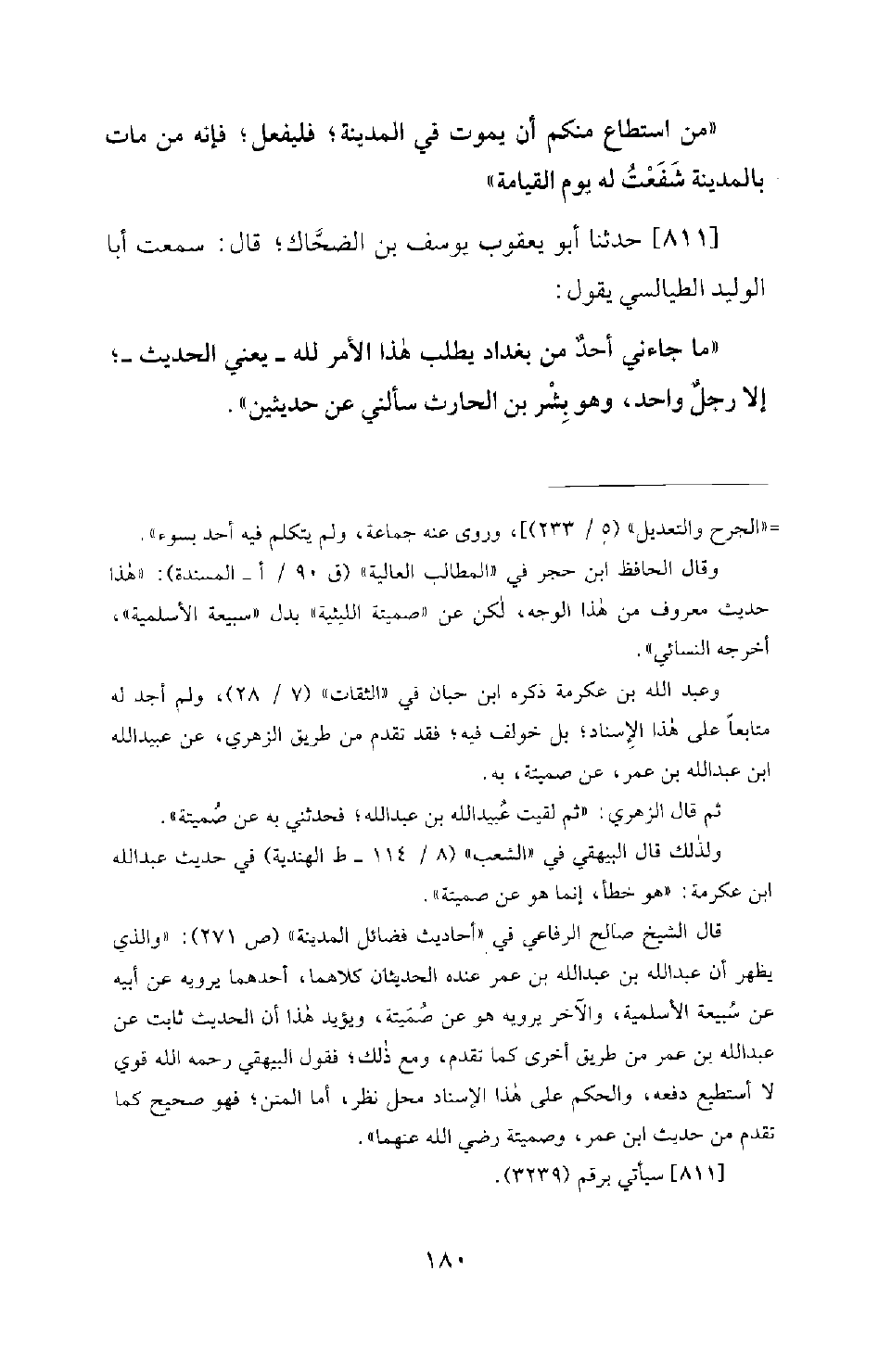 811 - حَدَّثَنَا أَبُو يَعْقُوبَ يُوسُفُ بْنُ الضَّحَّاكِ؛ قَالَ: سَمِعْتُ أَبَا الْوَلِيدِ الطَّيَالِسِيَّ يَقُولُ: مَا جَاءَنِي أَحَدٌ مِنْ بَغْدَادَ يطلب هَذَا الْأَمْرَ لِلَّهِ - يَعْنِي الْحَدِيثَ -؛ إِلَّا رَجُلٌ وَاحِدٌ، وَهُوَ بِشْرُ بْنُ الْحَارِثِ، سَأَلَنِي عَنْ حَدِيثَيْنِ.