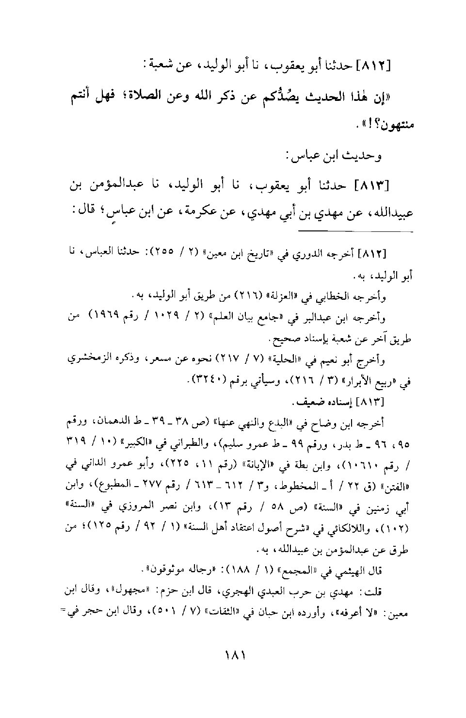 812 - حَدَّثَنَا أَبُو يَعْقُوبَ، نَا أَبُو الْوَلِيدِ، عَنْ شُعْبَةَ: إِنَّ هذا يَصُدُّكُمْ عَنْ ذِكْرِ اللهِ وَعَنِ الصَّلَاةِ؛ فهل أنتم منتهون؟ ! وحديث ابن عباس: