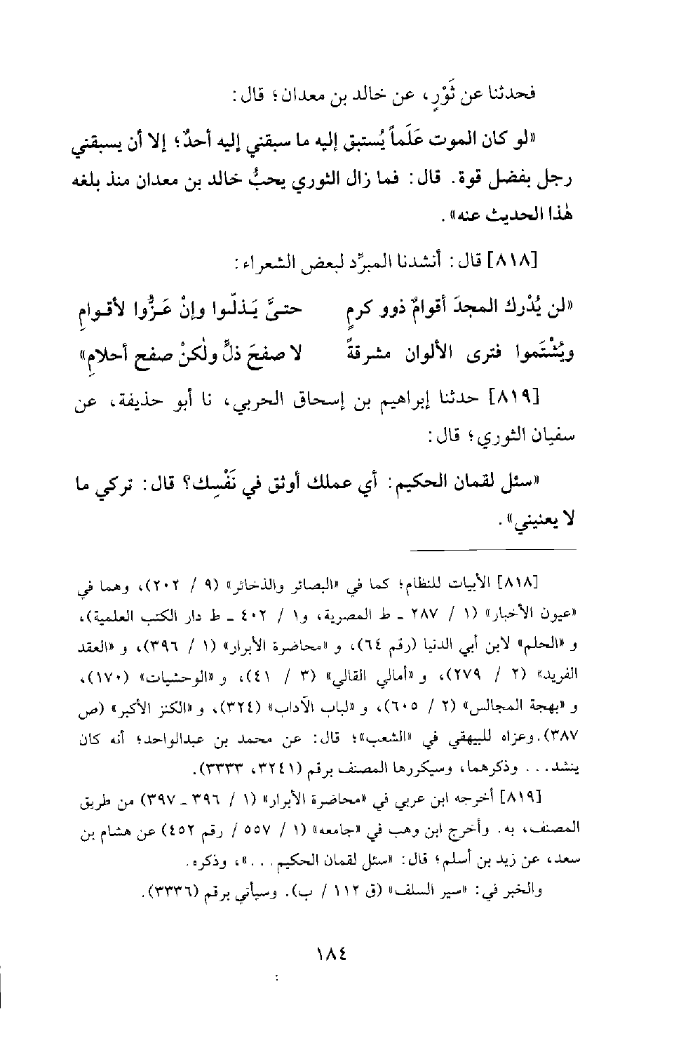 819 - حَدَّثَنَا إِبْرَاهِيمُ بْنُ إِسْحَاقَ الْحَرْبِيُّ، نَا أَبُو حُذَيْفَةَ، عَنْ سُفْيَانَ الثَّوْرِيِّ؛ قَالَ: سُئِلَ لُقْمَانُ الْحَكِيمُ: أَيُّ عَمَلِكَ أَوْثَقُ فِي نَفْسِكَ؟ قَالَ: تَرْكِي مَا لَا يَعْنِينِي.