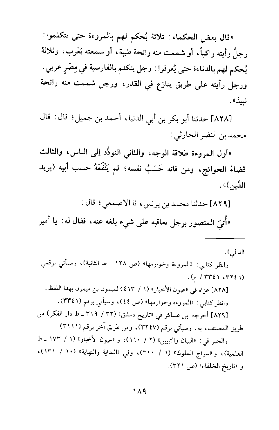 828 - حَدَّثَنَا أَبُو بَكْرِ بْنِ أَبِي الدنيا، عن أَحْمَدُ بْنُ جَمِيلٍ؛ قَالَ: قَالَ مُحَمَّدُ بْنُ النَّضْرِ الْحَارِثِيُّ: أَوَّلُ الْمُرُوءَةِ طَلَاقَةُ الْوَجْهِ، وَالثَّانِي التَّوَدُّدُ إِلَى النَّاسِ، وَالثَّالِثُ قَضَاءُ الْحَوَائِجِ، وَمَنْ فَاتَهُ حَسَبُ نَفْسِهِ؛ لَمْ يَنْفَعْهُ حَسَبُ أَبِيهِ (يُرِيدُ الدِّينَ) .