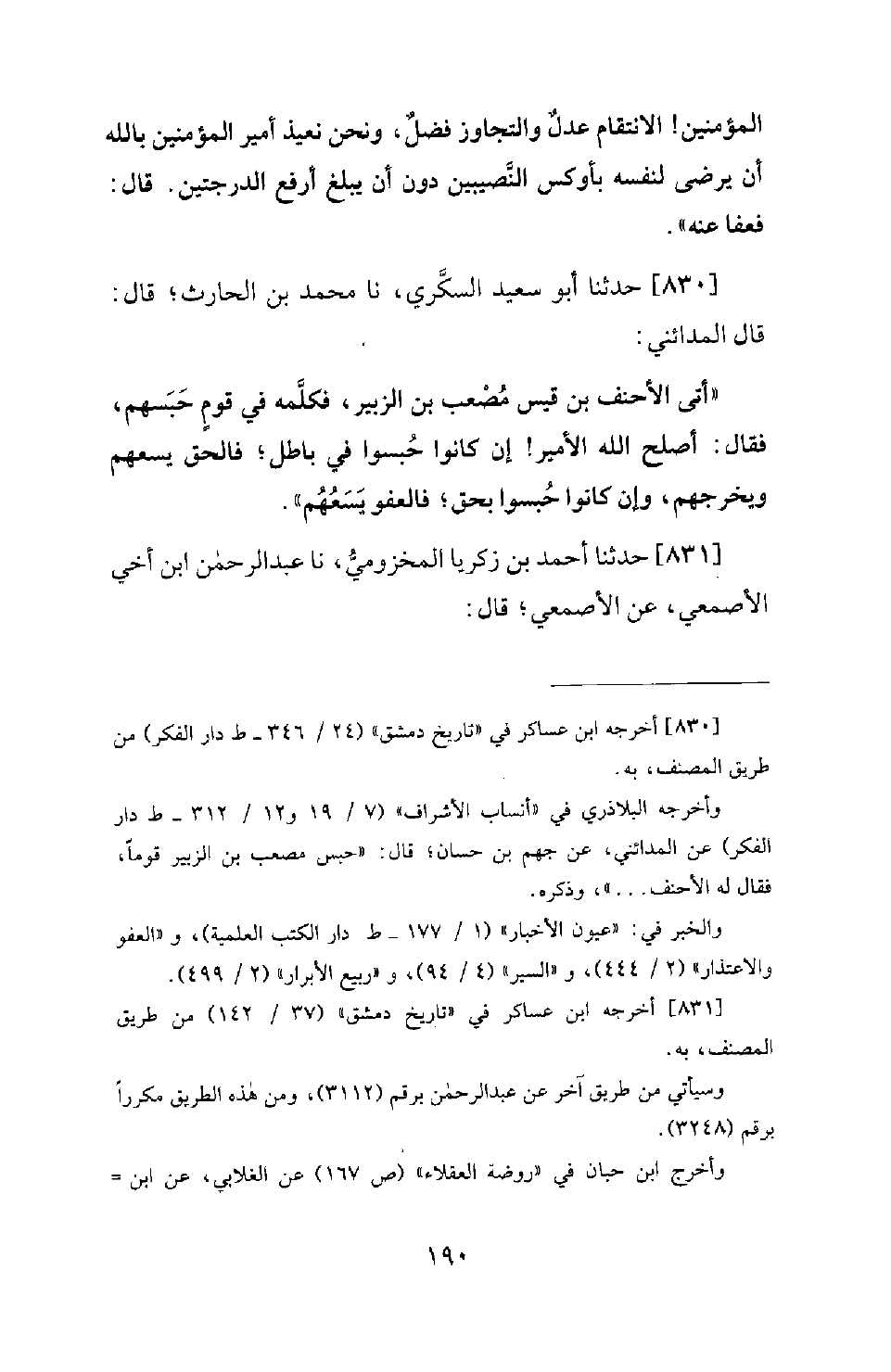 830 - حَدَّثَنَا أَبُو سَعِيدٍ السُّكَّرِيُّ، نَا مُحَمَّدُ بْنُ الْحَارِثِ؛ قَالَ: قَالَ الْمَدَائِنِيُّ: أَتَى الْأَحْنَفُ بْنُ قَيْسٍ مُصْعَبَ بْنَ الزُّبَيْرِ، فَكَلَّمَهُ فِي قَوْمٍ حَبَسَهُمْ، فَقَالَ: أَصْلَحَ اللهُ الأمير! إن كان حُبِسُوا فِي بَاطِلٍ؛ فَالْحَقُّ يَسَعُهُمْ وَيُخْرِجُهُمْ، وَإِنْ كَانُوا حُبِسُوا بِحَقٍّ؛ فَالْعَفْوُ يَسَعُهُمْ.
