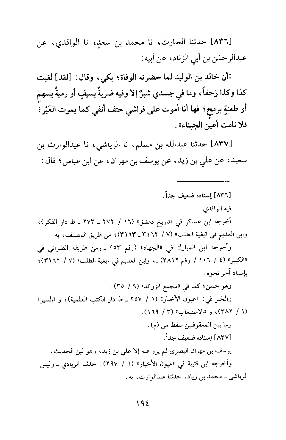 836 - حَدَّثَنَا الْحَارِثُ، نَا مُحَمَّدُ بْنُ سَعْدٍ، نَا الْوَاقِدِيُّ، عَنْ عَبْدِ الرَّحْمَنِ بْنِ أَبِي الزِّنَادِ، عَنْ أَبِيهِ: أَنَّ خَالِدَ بْنَ الْوَلِيدِ لَمَّا حَضَرَتْهُ الْوَفَاةُ؛ بَكَى، وَقَالَ: لَقَدْ لَقِيتُ كَذَا وَكَذَا زَحْفًا، وَمَا فِي جَسَدِي شِبْرٌ إِلَّا وَفِيهِ ضَرْبَةٌ بِسَيْفٍ أَوْ رَمْيَةٌ بِسَهْمٍ أَوْ طَعْنَةٌ بِرُمْحٍ؛ فَهَا أَنَا أَمُوتُ عَلَى فِرَاشِي حَتْفَ أَنْفِي كَمَا يَمُوتُ الْعِيرُ؛ فَلَا نَامَتْ أَعْيُنُ الْجُبُنَاءِ