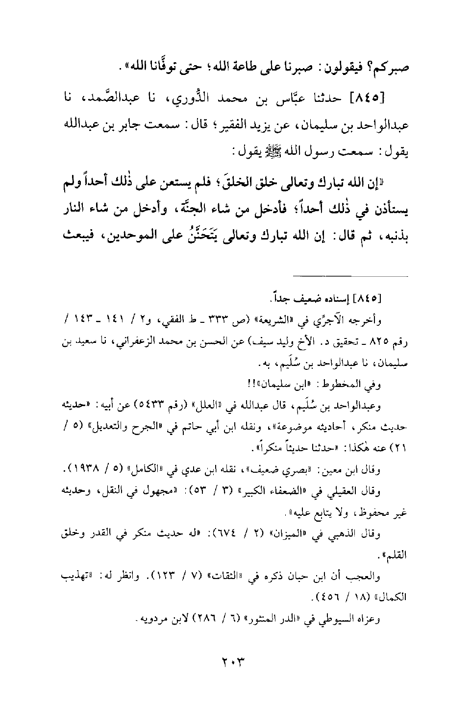 845 - حَدَّثَنَا عَبَّاسُ بْنُ مُحَمَّدٍ الدُّورِيُّ، نَا عَبْدُ الصَّمَدِ، نَا عَبْدُ الْوَاحِدِ بْنُ سُلَيْمَانَ، عَنْ يَزِيدَ الْفَقِيرِ؛ قَالَ: سَمِعْتُ جَابِرَ بْنَ عَبْدِ اللهِ يَقُولُ: سَمِعْتُ رَسُولَ اللهِ صَلَّى اللَّهُ عَلَيْهِ وَسَلَّمَ يَقُولُ: «إِنَّ اللهَ تَبَارَكَ وَتَعَالَى خَلَقَ الْخَلْقَ؛ فَلَمْ يَسْتَعِنْ عَلَى ذَلِكَ أَحَدًا، وَلَمْ يَسْتَأْذِنْ فِي ذَلِكَ أَحَدًا؛ فَأَدْخَلَ مَنْ شَاءَ الْجَنَّةَ، وَأَدْخَلَ مَنْ شَاءَ النَّارَ بِذَنْبِهِ. ثُمَّ قَالَ: إِنَّ اللهَ تَبَارَكَ وَتَعَالَى يَتَحَنَّنُ عَلَى الْمُوَحِّدِينَ، فَيَبْعَثُ -[204]- مَلَكًا مِنْ قِبَلِهِ بِمَاءٍ وَنُورٍ، فَيَدْخُلُ النَّارَ فَيَنْضَحُ؛ فَلَا يُصِيبُ إِلَّا مَنْ شَاءَ الله، ولم يصب إلا مَنْ خَرَجَ، وَلَمْ يُشْرِكْ بِاللهِ شَيْئًا؛ فَأَخْرَجَهُمْ، فَجَعَلَهُمْ بِفِنَاءِ الْجَنَّةِ، ثُمَّ رَجَعَ إِلَى رَبِّهِ عَزَّ وَجَلَّ؛ فَأَمَدَّهُ بِمَاءٍ وَنُورٍ وَدَخَلَ النَّارَ، فَفَعَلَ مِثْلَ ذَلِكَ، ثُمَّ أَدْخَلَهُمُ الْجَنَّةَ بِرَحْمَتِهِ وَشَفَاعَةِ رَبِّ الْعَالَمِينَ» .