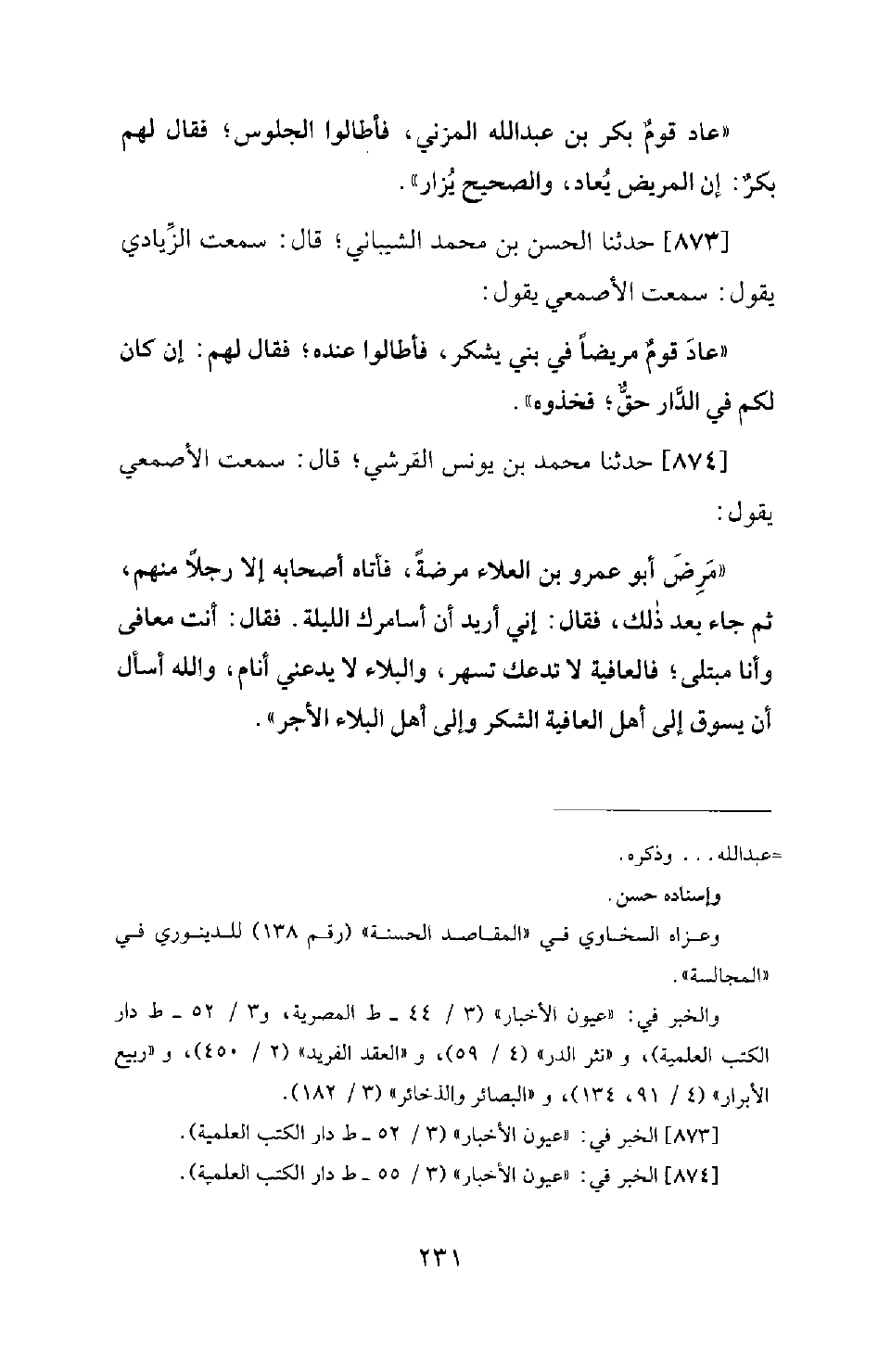 874 - حَدَّثَنَا مُحَمَّدُ بْنُ يُونُسَ الْقُرَشِيُّ؛ قَالَ: سَمِعْتُ الْأَصْمَعِيَّ يَقُولُ: مَرِضَ أَبُو عَمْرِو بْنُ الْعَلَاءِ مَرْضَةً، فَأَتَاهُ أَصْحَابُهُ إِلَّا رَجُلًا مِنْهُمْ، ثُمَّ جَاءَ بَعْدَ ذَلِكَ، فَقَالَ: إِنِّي أريد أن أُسَامِرُكَ اللَّيْلَةَ. فَقَالَ: أَنْتَ مُعَافَى وَأَنَا مُبْتَلَى؛ فَالْعَافِيَةُ لَا تَدَعُكَ تَسْهَرُ وَالْبَلَاءُ لَا يَدَعُنِي أَنَامُ، وَاللهَ أَسْأَلُ أَنْ يَسُوقَ إِلَى أَهْلِ الْعَافِيَةِ الشُّكْرَ، وَإِلَى أَهْلِ الْبَلَاءِ الْأَجْرَ.