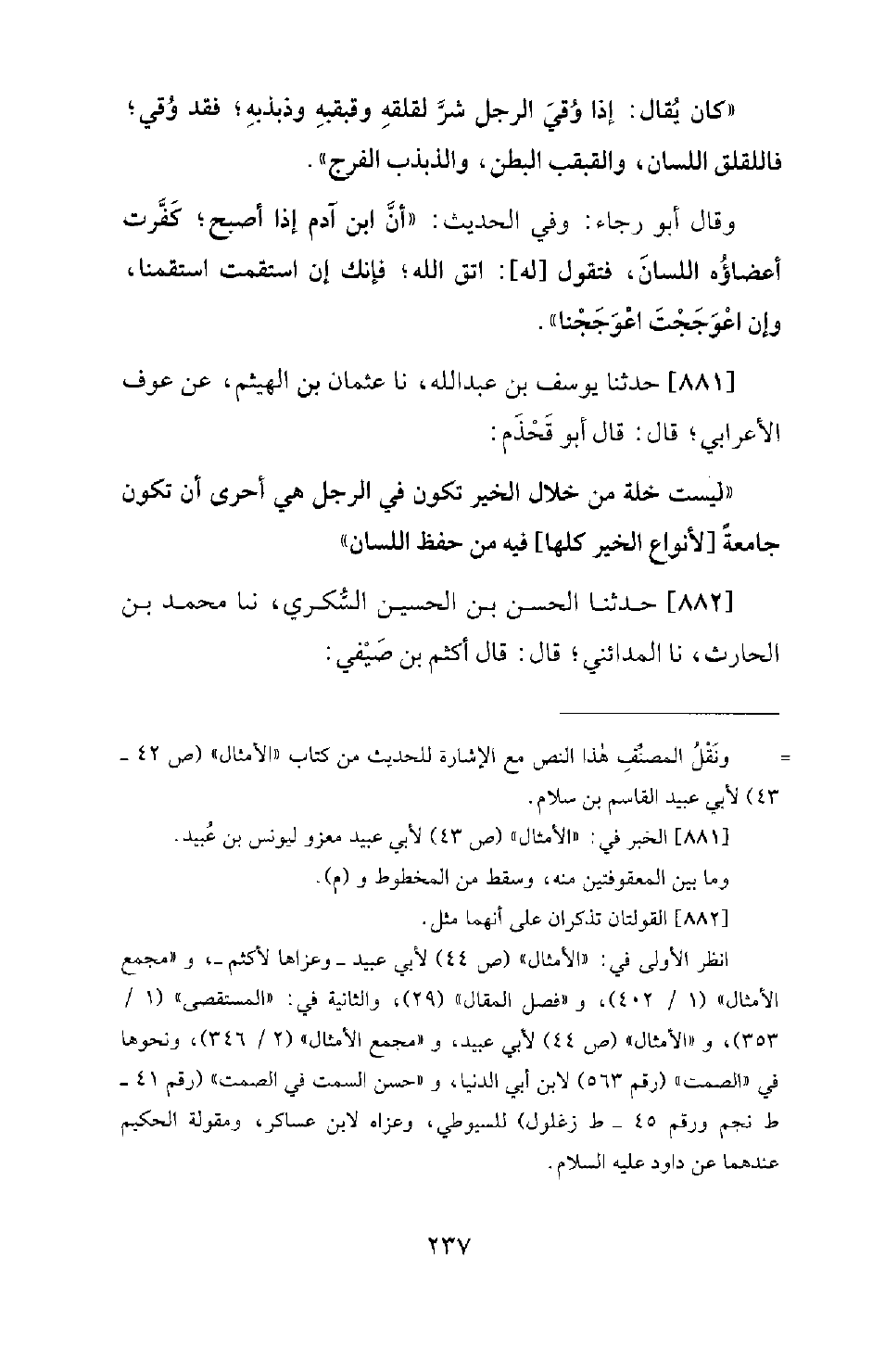 882 - حَدَّثَنَا الْحَسَنُ بْنُ الْحُسَيْنِ السُّكَّرِيُّ، نَا مُحَمَّدُ بْنُ الْحَارِثِ، نَا الْمَدَائِنِيُّ؛ قَالَ: قَالَ أَكْثَمُ بْنُ صَيْفِيٍّ: -[238]- الصَّمْتُ يُكْسِبُ أَهْلَهُ الْمَحَبَّةَ. وَقَالَ غَيْرُهُ مِنَ الْحُكَمَاءِ: النَّدَمُ عَلَى السُّكُوتِ خَيْرٌ مِنَ النَّدَمِ عَلَى الْقَوْلِ.