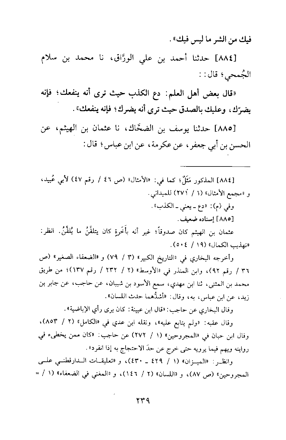 884 - حَدَّثَنَا أَحْمَدُ بْنُ عَلِيٍّ الْوَرَّاقُ، نَا مُحَمَّدُ بْنُ سَلَّامٍ الْجُمَحِيُّ؛ قَالَ: قَالَ بَعْضُ أَهْلِ الْعِلْمِ: دَعِ الْكَذِبَ حَيْثُ تَرَى أَنَّهُ يَنْفَعُكَ؛ فَإِنَّهُ يَضُرُّكَ، وَعَلَيْكَ بِالصِّدْقِ حَيْثُ تَرَى أَنَّهُ يَضُرُّكَ؛ فَإِنَّهُ يَنْفَعُكَ.