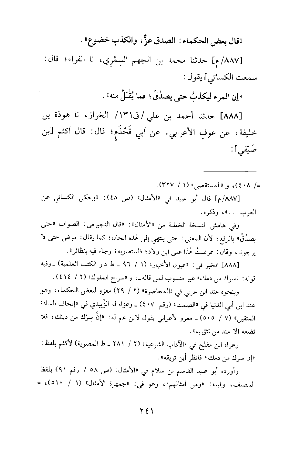 887 - / م - حَدَّثَنَا مُحَمَّدُ بْنُ الْجَهْمِ السِّمَّرِيُّ، نَا الْفَرَّاءُ؛ قَالَ: سَمِعْتُ الْكِسَائِيَّ يَقُولُ: إِنَّ الْمَرْءَ لَيَكْذِبُ؛ حَتَّى يَصْدُقَ؛ فَمَا يُقْبَلُ مِنْهُ.
