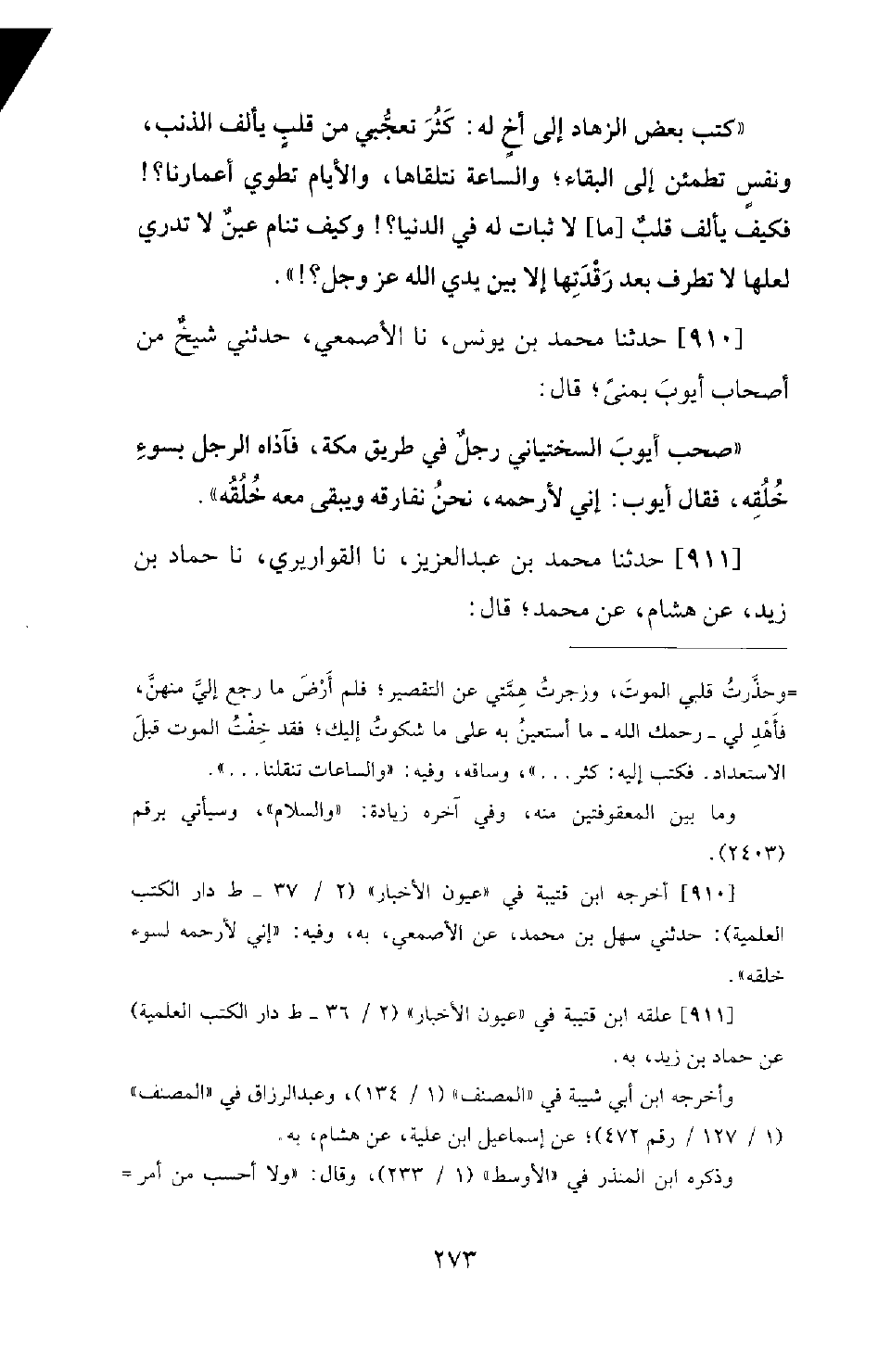 910 - حَدَّثَنَا مُحَمَّدُ بْنُ يُونُسَ، نَا الْأَصْمَعِيُّ، حَدَّثَنِي شَيْخٌ مِنْ أَصْحَابِ أَيُّوبَ بِمِنًى؛ قَالَ: صَحِبَ أَيُّوبَ السَّخْتِيَانِيَّ رَجُلٌ فِي طَرِيقِ مَكَّةَ، فَآذَاهُ الرَّجُلُ بِسُوءِ خُلُقِهِ، فَقَالَ أَيُّوبُ: إِنِّي لَأَرْحَمُهُ، نَحْنُ نُفَارِقُهُ وَيَبْقَى مَعَهُ خُلُقُهُ.