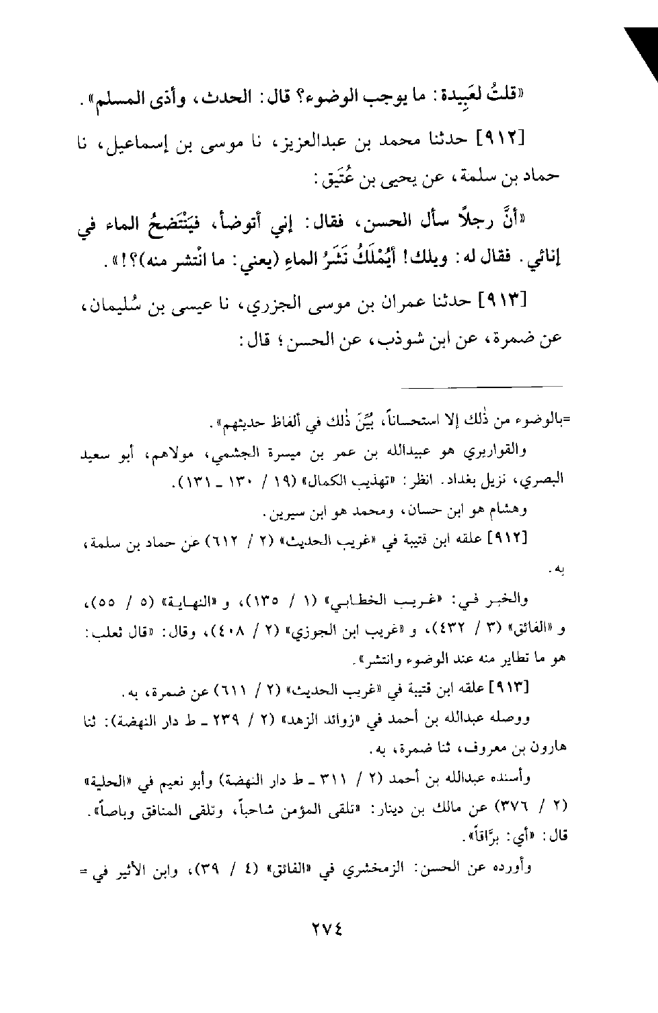 912 - حَدَّثَنَا مُحَمَّدُ بْنُ عَبْدِ الْعَزِيزِ، نَا مُوسَى بْنُ إِسْمَاعِيلَ، نَا حَمَّادُ بْنُ سَلَمَةَ، عَنْ يَحْيَى بْنِ عُتَيْقٍ: أَنَّ رَجُلًا سَأَلَ الْحَسَنَ، فَقَالَ: إِنِّي أَتَوَضَّأُ، فَيَنْتَضِحُ الْمَاءُ فِي إِنَائِي. فَقَالَ لَهُ: وَيْلَكَ! أَيُمْلَكُ نَشْرُ الْمَاءِ (يَعْنِي: مَا انْتَشَرَ مِنْهُ) ؟ !