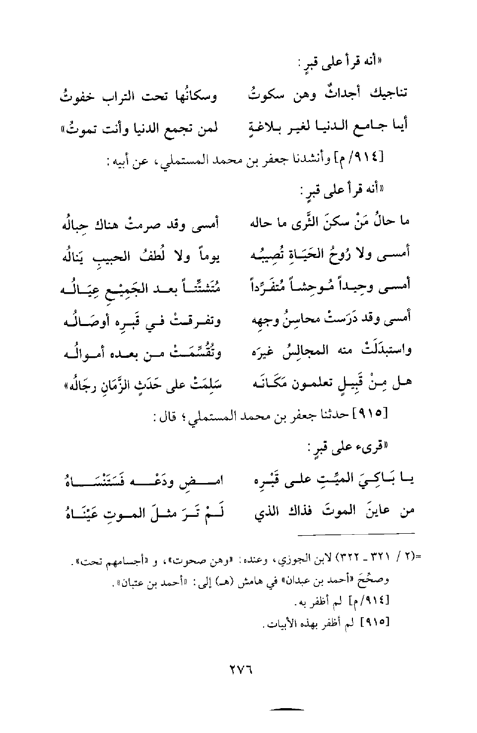 914 - / م - وَأَنْشَدَنَا جَعْفَرُ بْنُ مُحَمَّدٍ الْمُسْتَمْلِي، عَنْ أَبِيهِ: أَنَّهُ قَرَأَ عَلَى قَبْرٍ: