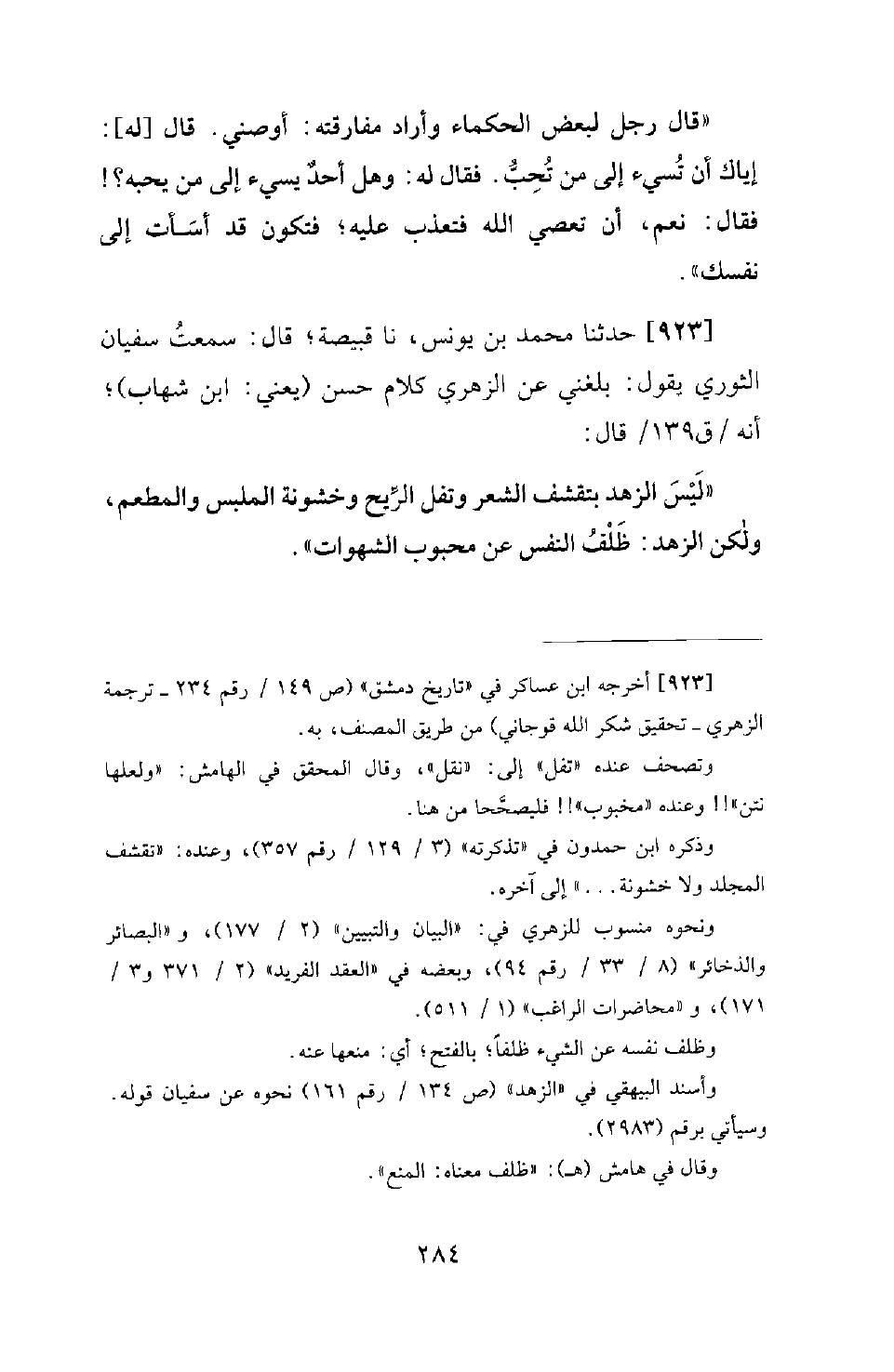 923 - حَدَّثَنَا مُحَمَّدُ بْنُ يُونُسَ، نَا قُبَيْصَةُ؛ قَالَ: سَمِعْتُ سُفْيَانَ الثَّوْرِيَّ يَقُولُ: بَلَغَنِي عَنِ الزُّهْرِيِّ كَلَامٌ حَسَنٌ (يَعْنِي: ابْنَ شِهَابٍ) ؛ أَنَّهُ قَالَ: لَيْسَ الزُّهْدُ بِتَقَشُّفِ الشَّعْرِ وتقل الرِّيحِ وَخُشُونَةِ الْمَلْبَسِ وَالْمَطْعَمِ، وَلَكِنَّ الزُّهْدَ: ظَلْفُ النَّفْسِ عَنْ مَحْبُوبِ الشَّهَوَاتِ.