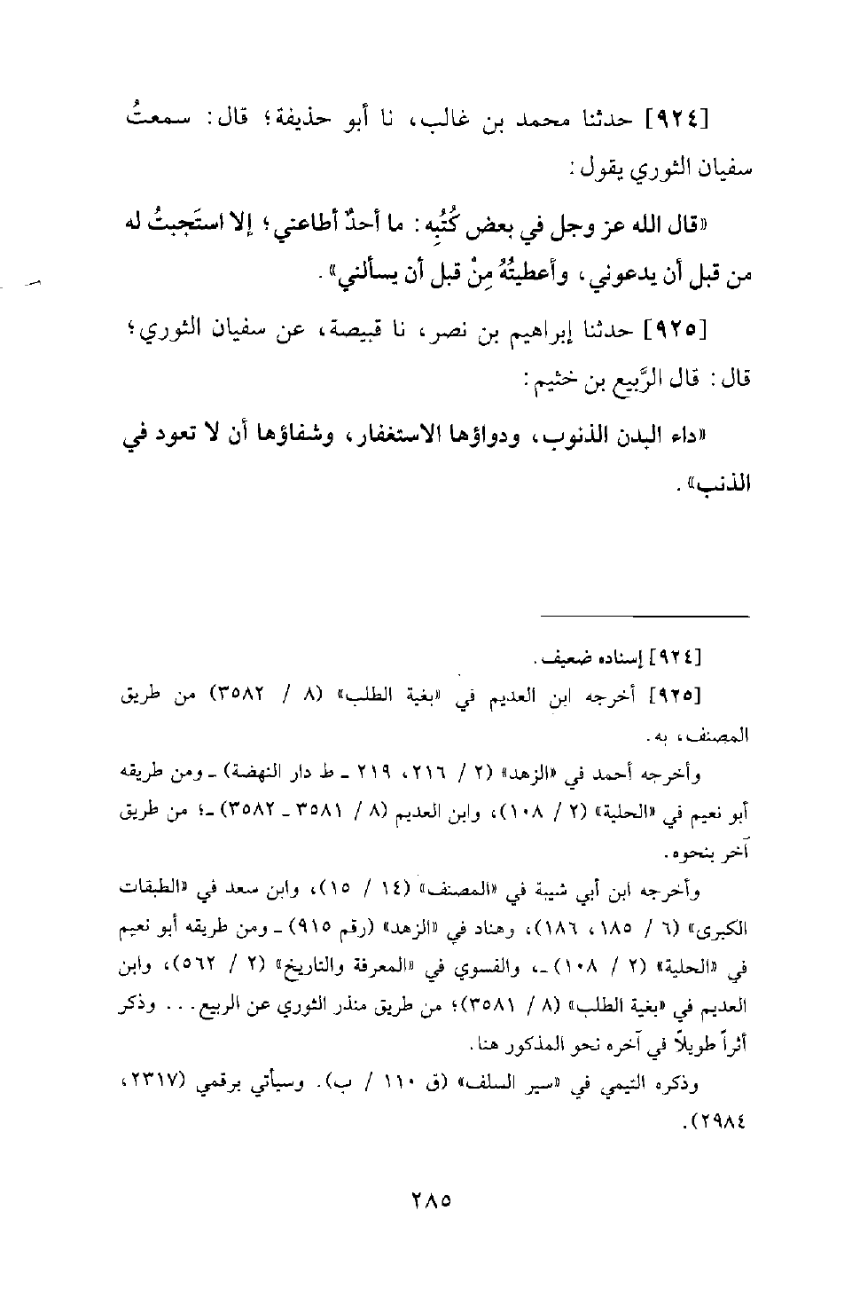 925 - حَدَّثَنَا إِبْرَاهِيمُ بْنُ نَصْرٍ، نَا قُبَيْصَةُ، عَنْ سُفْيَانَ الثَّوْرِيِّ؛ قَالَ: قَالَ الرَّبِيعُ بْنُ خُثَيْمٍ: دَاءُ الْبَدَنِ الذُّنُوبُ، وَدَوَاؤُهَا الِاسْتِغْفَارُ، وَشِفَاؤُهَا أَنْ لَا تَعُودَ فِي الذَّنْبِ.