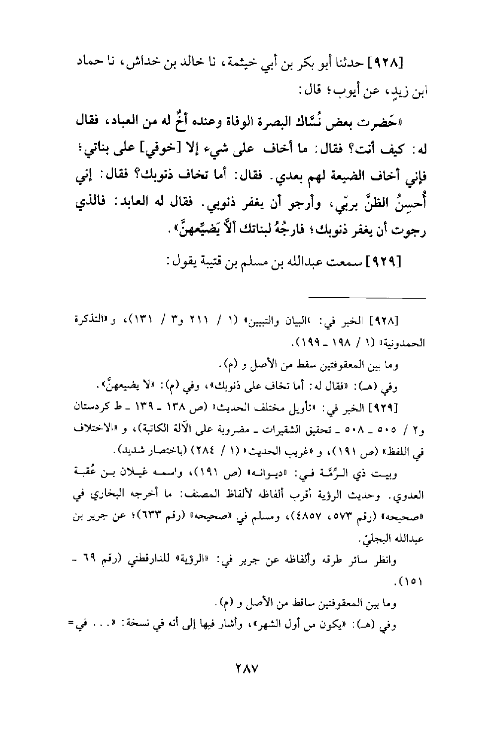 928 - حَدَّثَنَا أَبُو بَكْرِ بْنِ أَبِي خَيْثَمَةَ، نَا خَالِدُ بْنُ خِدَاشٍ، نَا حَمَّادُ بْنُ زَيْدٍ، عَنْ أَيُّوبَ؛ قَالَ: حَضَرَتْ بَعْضَ نُسَّاكِ الْبَصْرَةِ الْوَفَاةُ وَعَندَهُ أَخٌ لَهُ مِنَ الْعُبَّادِ، فَقَالَ لَهُ: كَيْفَ أَنْتَ؟ فَقَالَ: مَا أَخَافُ عَلَى شَيْءٍ إِلَّا [خَوْفِي] عَلَى بَنَاتِي، فَإِنِّي أَخَافُ الضَّيْعَةَ لَهْمُ بَعْدِي. فَقَالَ: أَمَا تَخَافُ ذُنُوبَكَ؟ فَقَالَ: إِنِّي أُحْسِنُ الظَّنَّ بِرَبِّي، وَأَرْجُو أَنْ يَغْفِرَ ذُنُوبِي. فَقَالَ لَهُ الْعَابِدُ: فَالَّذِي رَجَوْتَ أَنْ يَغْفِرَ ذُنُوبَكَ؛ فَارْجُهُ لِبَنَاتِكَ أَلَّا يُضَيِّعَهُنَّ.