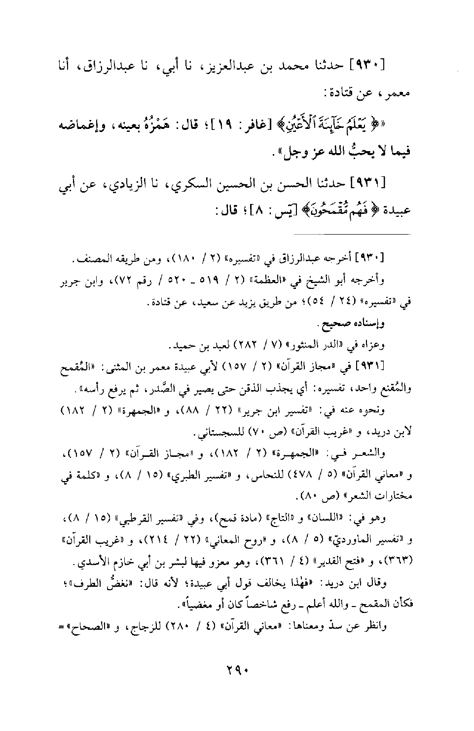 931 - حَدَّثَنَا الْحَسَنُ بْنُ الْحُسَيْنِ السُّكَّرِيُّ، نَا الزِّيَادِيُّ، عَنْ أَبِي عُبَيْدَةَ {فهم مقمحون} [يس: 8] ؛ قَالَ: -[291]- الْقَمِحُ: الَّذِي يَرْفَعُ رَأْسَهُ وَيَغُضُّ بَصَرَهُ. يُقَالُ: بَعِيرٌ قَامِحٌ وَإِبِلٌ قِمَاحٌ: إِذَا رَوِيَتْ مِنَ الْمَاءِ وَقَمِحَتْ. قَالَ الشَّاعِرُ - وَذَكَرَ السَّفِينَةَ -: