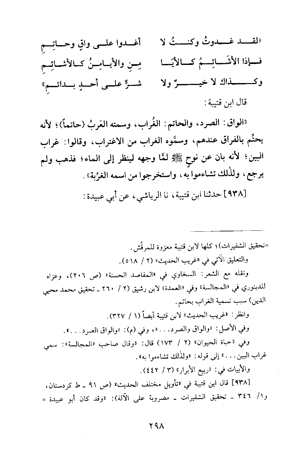 938 - حَدَّثَنَا ابْنُ قُتَيْبَةَ، نَا الرِّيَاشِيُّ، عَنْ أَبِي عُبَيْدَةَ: -[299]- أَنَّ رَجُلَيْنِ خَرَجَا فِي سَفَرٍ، فَوَقَعَ عَلَيْهِمَا اللُّصُوصُ، فَقَاتَلَ أَحَدُهُمَا حَتَّى غُلِبَ وَأُخِذَ وَهَرَبَ رَفِيقُهُ؛ فَأَخَذُوا مَا كَانَ مَعَهُ، وَدُفِنَ حَيًّا، وَتُرِكَ رَأْسُهُ بارزا، فجاءت الْغِرْبَانُ وَسِبَاعُ الطَّيْرِ، فَحَامَتْ حَوْلَهُ تُرِيدُ أَنْ تَنْهَشَهُ وَتَقْلَعَ عَيْنَيْهِ، وَرَأَى ذَلِكَ كَلْبٌ كَانَ مَعَهُ؛ فَلَمْ يَزَلِ الْكَلْبُ يَنْبِشُ التُّرَابَ عَنْهُ حَتَّى اسْتَخْرَجَهُ، وَمِنْ قَبْلُ مَا قَدْ فَرَّ صَاحِبُهُ وَأَسْلَمَهُ. قَالَ: فَفِي ذلك يَقُولُ الشَّاعِرُ: