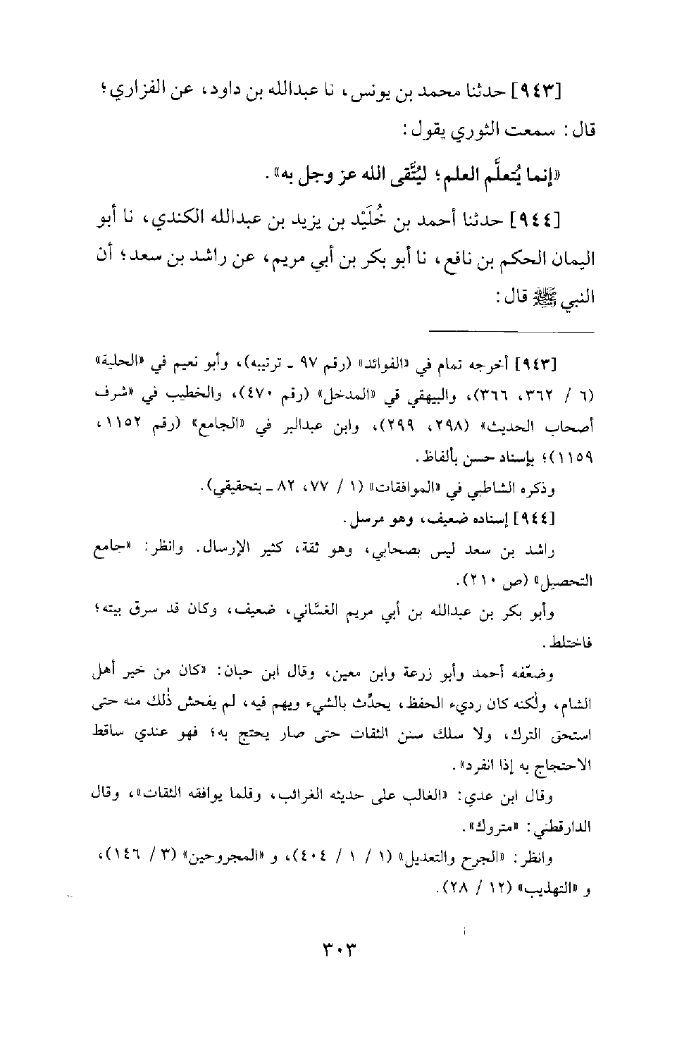 943 - حَدَّثَنَا مُحَمَّدُ بْنُ يُونُسَ، نَا عَبْدُ اللهِ بْنُ دَاوُدَ، عَنِ الْفَزَارِيِّ؛ قَالَ: سَمِعْتُ الثَّوْرِيَّ يَقُولُ: إِنَّمَا يُتَعَلَّمُ الْعِلْمَ؛ لِيُتَّقَى الله عَزَّ وَجَلَّ بِهِ.