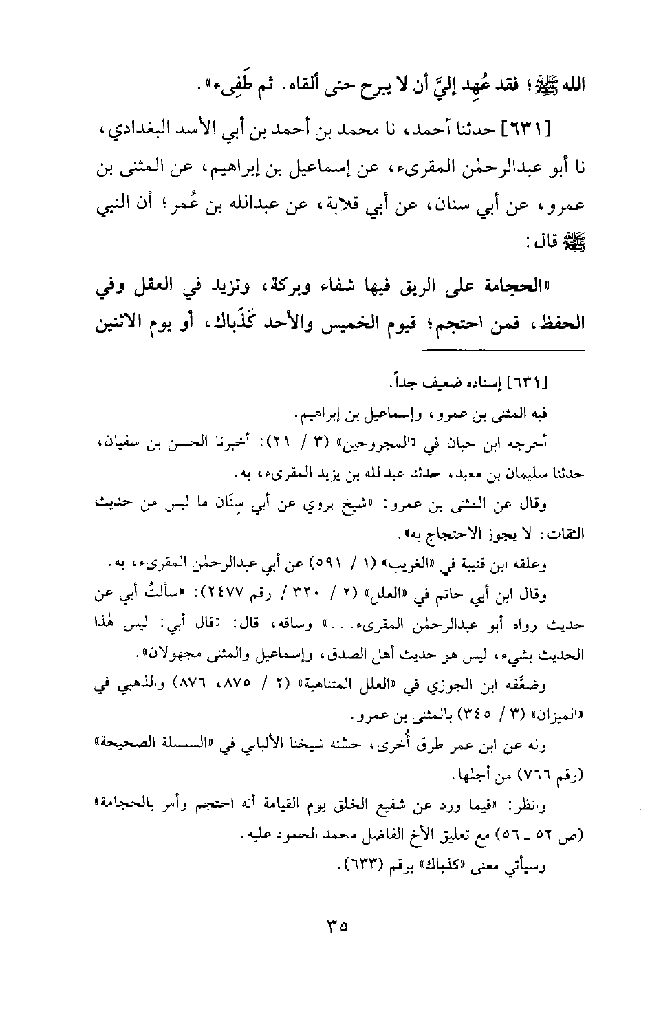 631 - حَدَّثَنَا أَحْمَدُ، نَا مُحَمَّدُ بْنُ أَحْمَدَ بْنِ أَبِي الْأَسَدِ الْبَغْدَادِيُّ، نَا أَبُو عَبْدِ الرَّحْمَنِ الْمُقْرِئُ، عَنْ إِسْمَاعِيلَ بْنِ إِبْرَاهِيمَ، عَنِ الْمُثَنَّى بْنِ عَمْرٍو، عَنْ أَبِي سِنَانٍ، عَنْ أَبِي قِلَابَةَ، عَنْ عَبْدِ اللهِ بْنِ عُمَرَ؛ أَنَّ النَّبِيَّ صَلَّى اللَّهُ عَلَيْهِ وَسَلَّمَ؛ قَالَ: «الْحِجَامَةُ عَلَى الرِّيقِ فِيهَا شِفَاءٌ وَبَرَكَةٌ، وَتَزِيدُ فِي الْعَقْلِ وَفِي الْحِفْظِ، فَمَنِ احْتَجَمَ؛ فَيَوْمَ الْخَمِيسِ وَالْأَحَدِ كَذَبَاكَ، أَوْ يَوْمَ الِاثْنَيْنِ -[36]- وَالثُّلَاثَاءِ؛ فَإِنَّهُ الْيَوْمُ الَّذِي كَشَفَ اللهُ فِيهِ الْبَلَاءَ عَنْ أَيُّوبَ، وَأَصَابَهُ يَوْمَ الْأَرْبِعَاءِ» . ثُمَّ قَالَ: «وَلَا يَبْدُوا بِأَحَدٍ شَيْءٌ مِنَ الْجُذَامِ أَوِ الْبَرَصِ إِلَّا يَوْمَ الْأَرْبِعَاءِ أَوْ لَيْلَةَ الْأَرْبِعَاءِ»