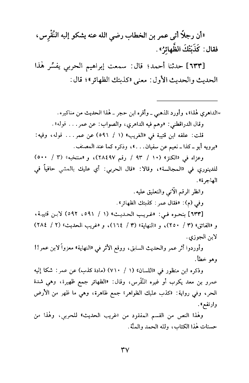 633 - حَدَّثَنَا أَحْمَدُ؛ قَالَ: سَمِعْتُ إِبْرَاهِيمَ الْحَرْبِيَّ يُفَسِّرُ هَذَا الْحَدِيثُ وَالْحَدِيثُ الْأَوَّلُ: مَعْنَى: «كَذَبَتْكَ الظَّهَائِرُ» ؛ قَالَ -[38]-: «هذا تقوله الْعَرَبُ فِي مَعْنَى الْإِغْرَاءِ: كَذَبَتْكَ كَذَا؛ أَيْ: عَلَيْكَ بِهِ. فَأَرَادَ عُمَرُ رَضِيَ اللهُ عَنْهُ لِصَاحِبِ النِّقْرِسِ أَنْ يَبْرُزَ إِلَى الْحَرِّ فِي الْهَاجِرَةِ وَيَمْشِي فِيهَا حَافِيًا؛ فَإِنَّ ذَلِكَ يُذْهِبُ عَنْهُ النِّقْرِسَ.
