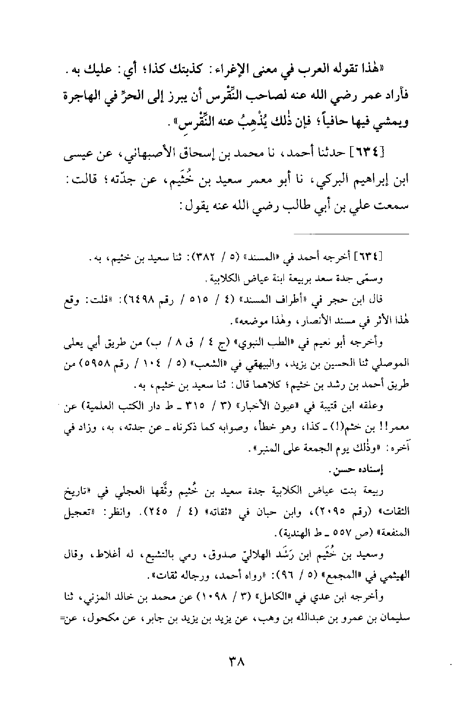 634 - حَدَّثَنَا أَحْمَدُ، نَا محمد بن إِسْحَاقُ الْأَصْبَهَانِيُّ، عَنْ عِيسَى بْنِ إِبْرَاهِيمَ الْبَرْكِيِّ، نَا أَبُو مَعْمَرٍ سَعِيدُ بْنُ خُثَيْمٍ، عَنْ جَدَّتِهِ؛ قَالَتْ: سَمِعْتُ عَلَيَّ بْنَ أَبِي طَالِبٍ رَضِيَ اللهُ عَنْهُ يَقُولُ: -[40]- إِذَا أَكَلْتُمُ الرُّمَّانَ؛ فَكُلُوهُ بِشَحْمِهِ؛ فَإِنَّهُ دِبَاغٌ لِلْمَعِدَةِ