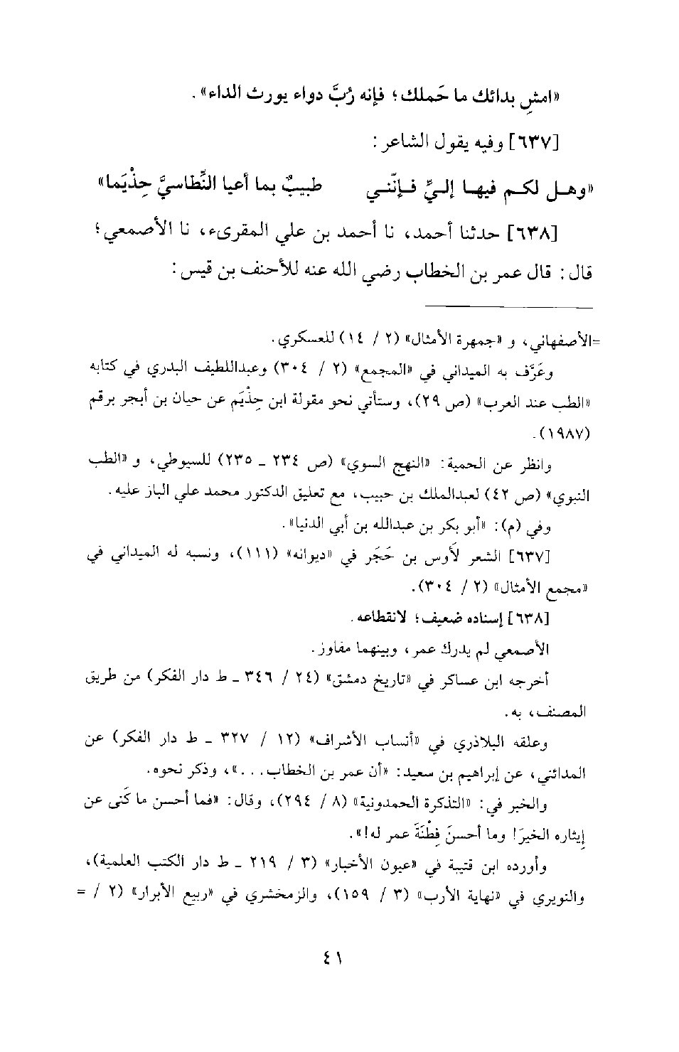 638 - حَدَّثَنَا أَحْمَدُ، نَا أَحْمَدُ بْنُ عَلِيِّ الْمُقْرِئُ، نَا الْأَصْمَعِيُّ؛ قَالَ: قَالَ عُمَرُ بْنُ الْخَطَّابِ رَضِيَ اللهُ عَنْهُ لِلْأَحْنَفِ بْنِ قَيْسٍ: -[42]- أَيُّ الطَّعَامِ أَحَبُّ إِلَيْكَ؟ قَالَ: الزُّبْدُ وَالْكَمْأَةُ. فَقَالَ عُمَرُ: مَا هُمَا بِأَحَبِّ الطَّعَامِ إِلَيْهِ، وَلَكِنَّهُ يُحِبُّ خَصْبَ الْمُسْلِمِينَ