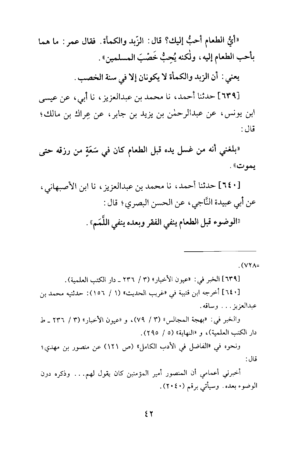 639 - حَدَّثَنَا أَحْمَدُ، نَا مُحَمَّدُ بْنُ عَبْدِ الْعَزِيزِ، نَا أَبِي، عَنْ عِيسَى بْنِ يُونُسَ، عَنْ عَبْدِ الرَّحْمَنِ بْنِ يَزِيدَ بْنِ جَابِرٍ، عَنْ عِرَاكِ بْنِ مَالِكٍ؛ قَالَ: بَلَغَنِي أَنَّهُ مَنْ غَسَلَ يَدَهُ قَبْلَ الطَّعَامِ كَانَ فِي سَعَةٍ مِنْ رِزْقِهِ حَتَّى يَمُوتَ.