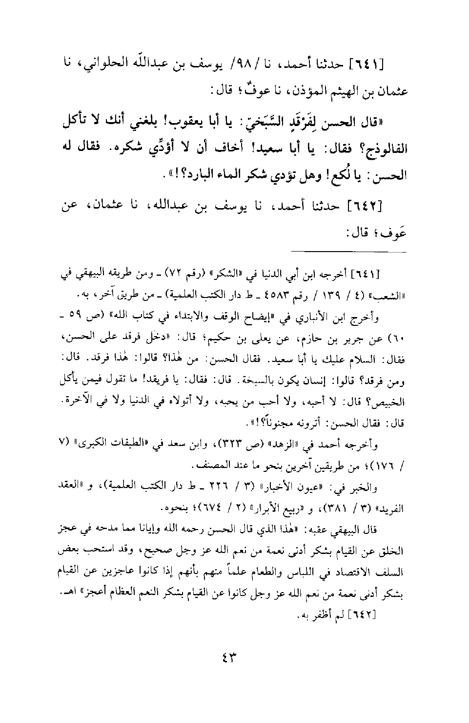 641 - حَدَّثَنَا أَحْمَدُ، نَا يُوسُفُ بْنُ عَبْدِ اللهِ الْحُلْوَانِيُّ، نَا عُثْمَانُ بْنُ الْهَيْثَمِ الْمُؤَذِّنُ، نَا عَوْفٌ؛ قَالَ: قَالَ الْحَسَنُ لِفَرْقَدٍ السَّبَخِيِّ: يَا أَبَا يَعْقُوبَ! بَلَغَنِي أَنَّكَ لَا تَأْكُلُ الْفَالَوْذَجَ؟ فَقَالَ: يَا أَبَا سَعِيدٍ! أَخَافُ أَنْ لَا أُؤَدِّي شُكْرَهُ. فَقَالَ لَهُ الْحَسَنُ: يَا لُكَعُ! وَهَلْ تُؤَدِّي شُكْرَ الْمَاءِ الْبَارِدِ؟ !