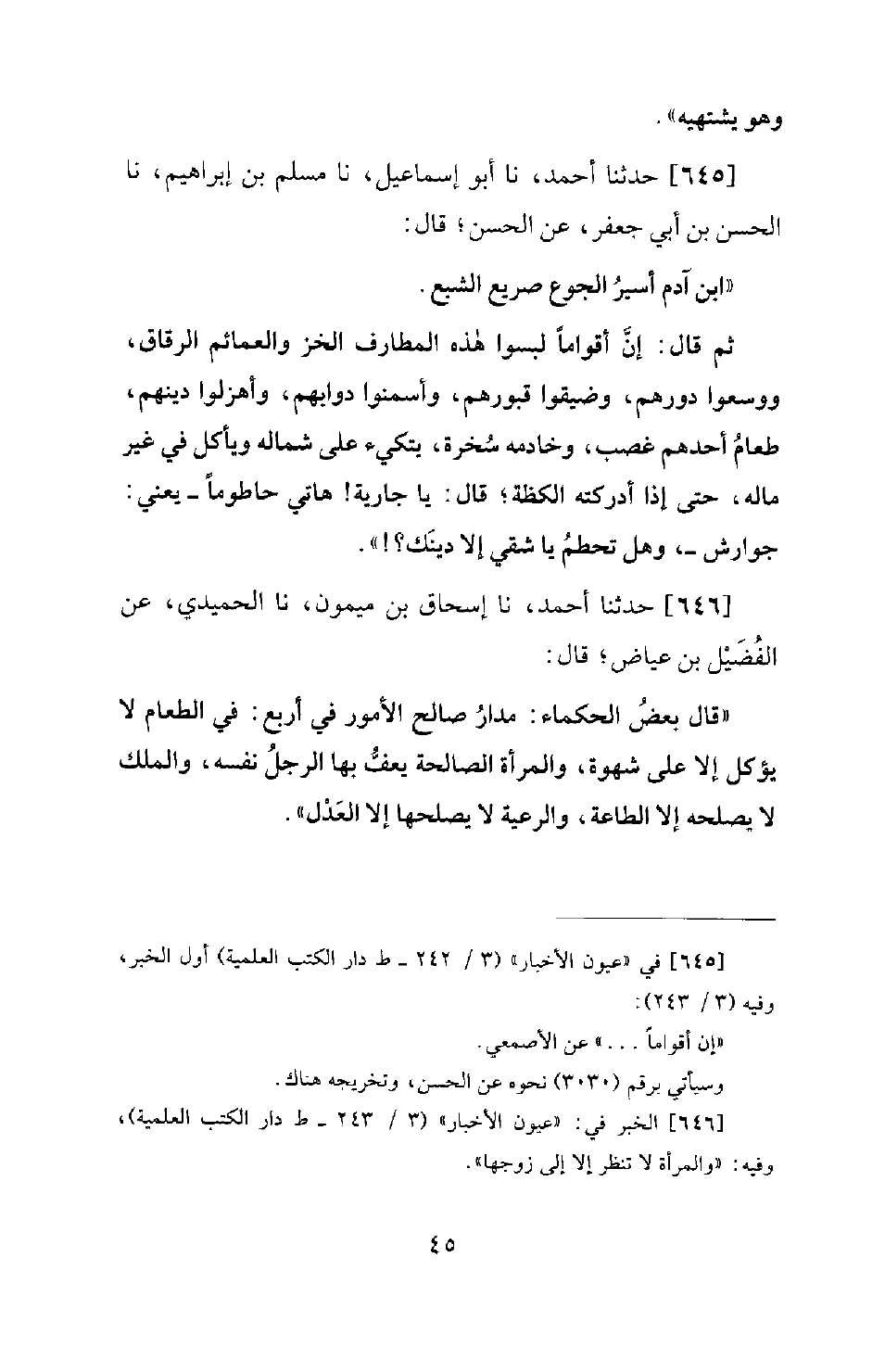 645 - حَدَّثَنَا أَحْمَدُ، نَا أَبُو إِسْمَاعِيلَ، نَا مُسْلِمُ بْنُ إِبْرَاهِيمَ، نَا الْحَسَنُ بْنُ أَبِي جَعْفَرٍ، عَنِ الْحَسَنِ؛ قَالَ: ابْنُ آدَمَ أَسِيرُ الْجُوعِ صَرِيعُ الشَّبَعِ. ثُمَّ قَالَ: إِنَّ أَقْوَامًا لَبِسُوا هَذِهِ الْمَطَارِفَ الْخَزَّ وَالْعَمَائِمَ الرِّقَاقَ، وَوَسَّعُوا دُورَهُمْ، وَضَيَّقُوا قُبُورَهُمْ، وَأَسْمَنُوا دَوَابَّهُمْ، وَأَهْزَلُوا دِينَهُمْ، طَعَامُ أَحَدِهِمْ غَصْبٌ، وَخَادِمُهُ سُخْرَةٌ، يتكئ عَلَى شِمَالِهِ، وَيَأْكُلُ فِي غَيْرِ مَالِهِ، حَتَّى إِذَا أَدْرَكَتْهُ الْكَظَّةُ؛ قَالَ: يَا جَارِيَةُ! هَاتِي حَاطُومًا - يَعْنِي: جَوَارِشَ -، وَهَلْ تَحْطِمُ يَا شَقِيُّ إِلَّا دِينَكَ؟ !