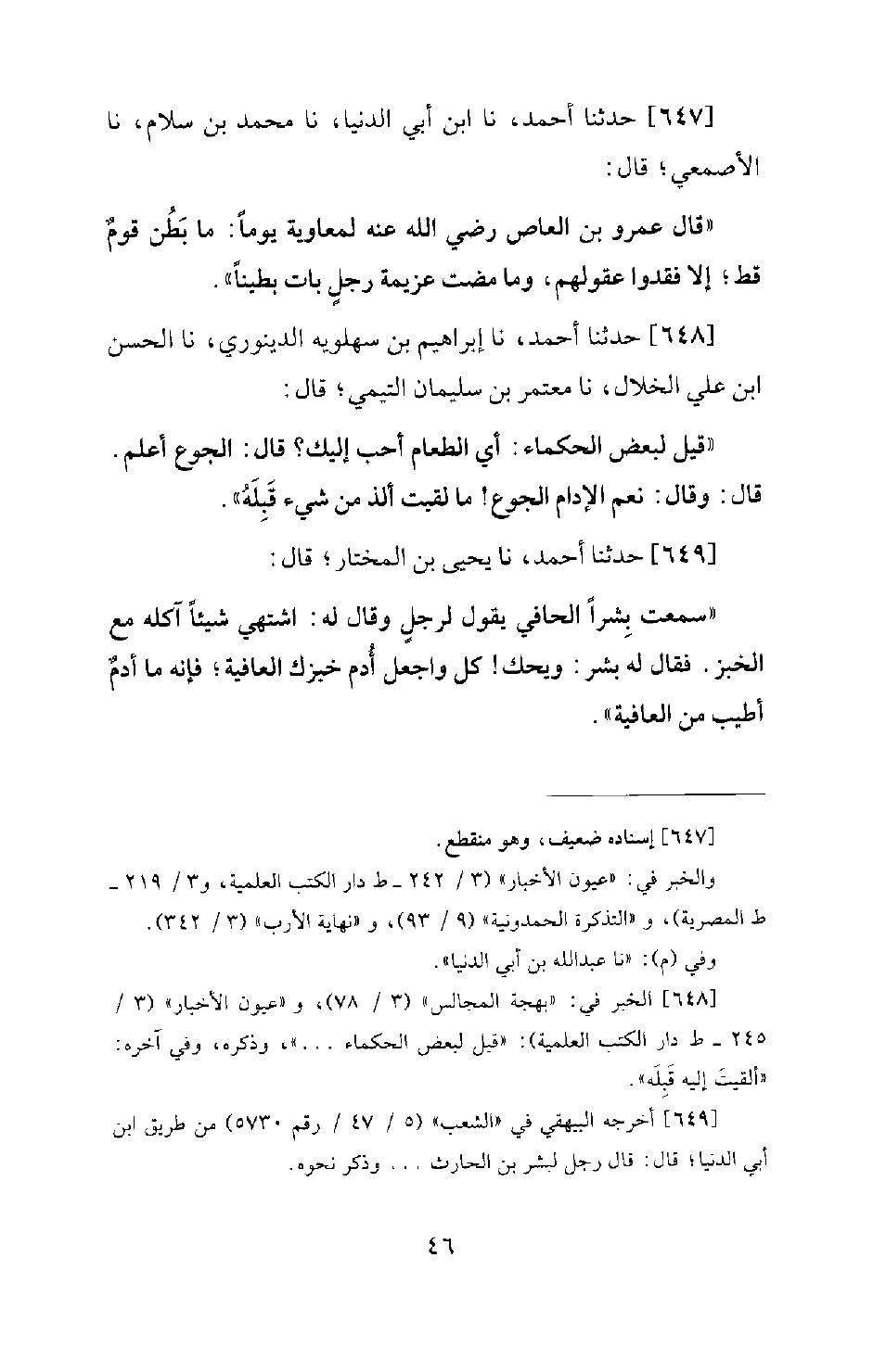 649 - حَدَّثَنَا أَحْمَدُ، نَا يَحْيَى بْنُ الْمُخْتَارِ؛ قَالَ: سَمِعْتُ بِشْرًا الْحَافِيَ يَقُولُ لِرَجُلٍ وَقَالَ لَهُ: أَشْتَهِي شَيْئًا آكُلُهُ مَعَ الْخُبْزِ. فَقَالَ لَهُ بِشْرٌ: وَيْحَكَ! كُلْ وَاجْعَلْ أُدْمَ خُبْزِكَ الْعَافِيَةَ؛ فَإِنَّهُ مَا أُدْمٌ أَطْيَبُ مِنَ الْعَافِيَةِ.