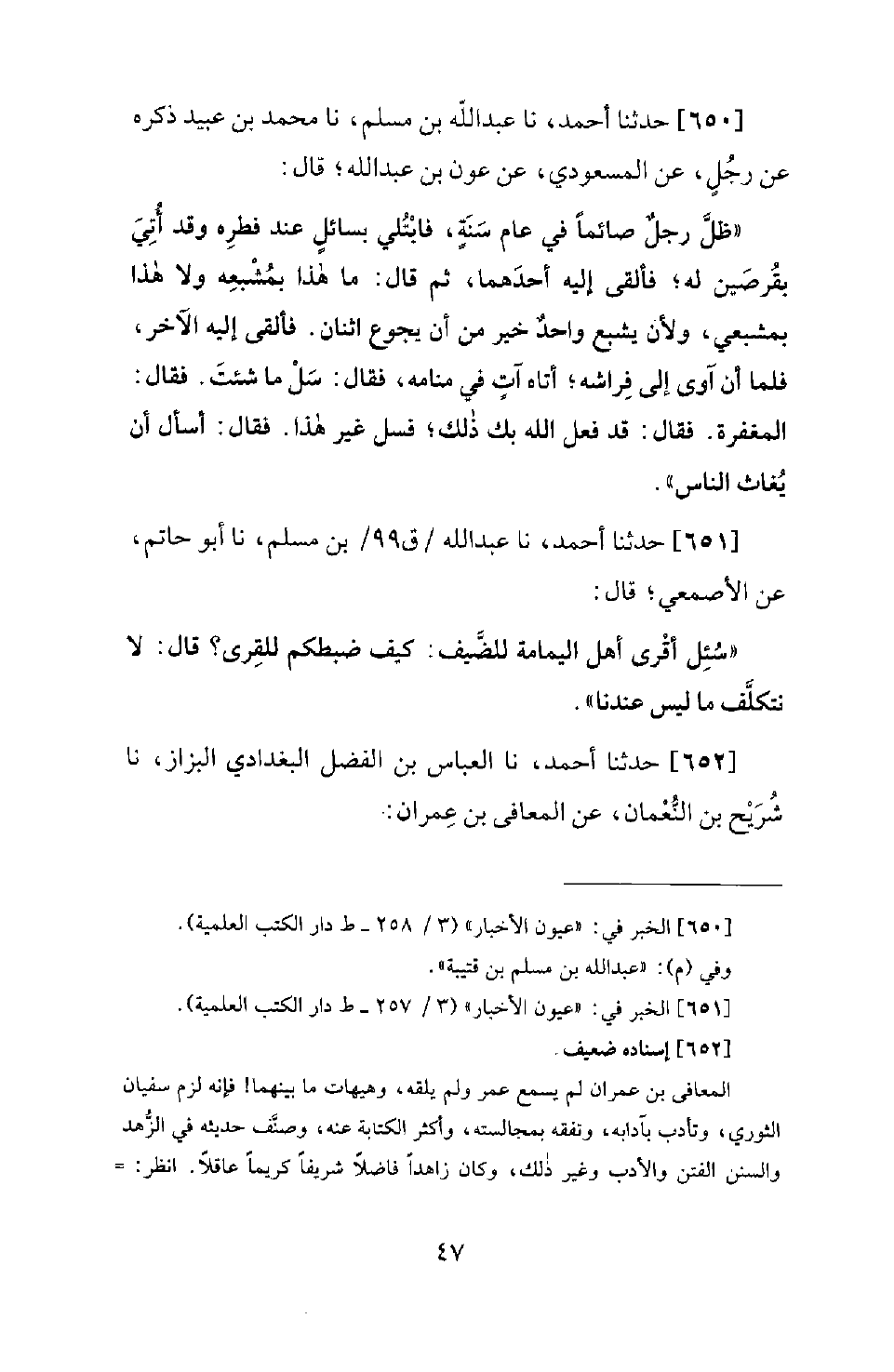 650 - حَدَّثَنَا أَحْمَدُ، نَا عَبْدُ اللهِ بْنُ مُسْلِمٍ، نَا مُحَمَّدُ بْنُ عُبَيْدٍ، ذَكَرَهُ عَنْ رَجُلٍ، عَنِ الْمَسْعُودِيِّ، عَنْ عَوْنِ بْنِ عَبْدِ اللهِ؛ قَالَ: ظَلَّ رَجُلٌ صَائِمًا فِي عَامٍ سَنَةٍ، فَابْتُلِيَ بِسَائِلٍ عِنْدَ فِطْرِهِ، وَقَدْ أوتيَ بِقُرْصَيْنَ لَهُ؛ فَأَلْقَى إِلَيْهِ أَحَدَهُمَا ثُمَّ قَالَ: مَا هَذَا بِمُشْبِعِهِ وَلَا هَذَا بِمُشْبِعِي، وَلَأَنْ يَشْبَعَ وَاحِدٌ خَيْرٌ مِنْ أَنْ يَجُوعَ اثْنَانِ. فَأَلْقَى إِلَيْهِ الْآخَرَ، فَلَمَّا أَنْ آوَى إِلَى فِرَاشِهِ؛ أَتَاهُ آتٍ فِي مَنَامِهِ، فَقَالَ: سَلْ مَا شِئْتَ. فَقَالَ: الْمَغْفِرَةَ. فَقَالَ: قَدْ فَعَلَ اللهُ بِكَ ذَلِكَ؛ فَسَلْ غَيْرَ هَذَا. فَقَالَ: اسأل أَنْ يُغَاثَ النَّاسُ.