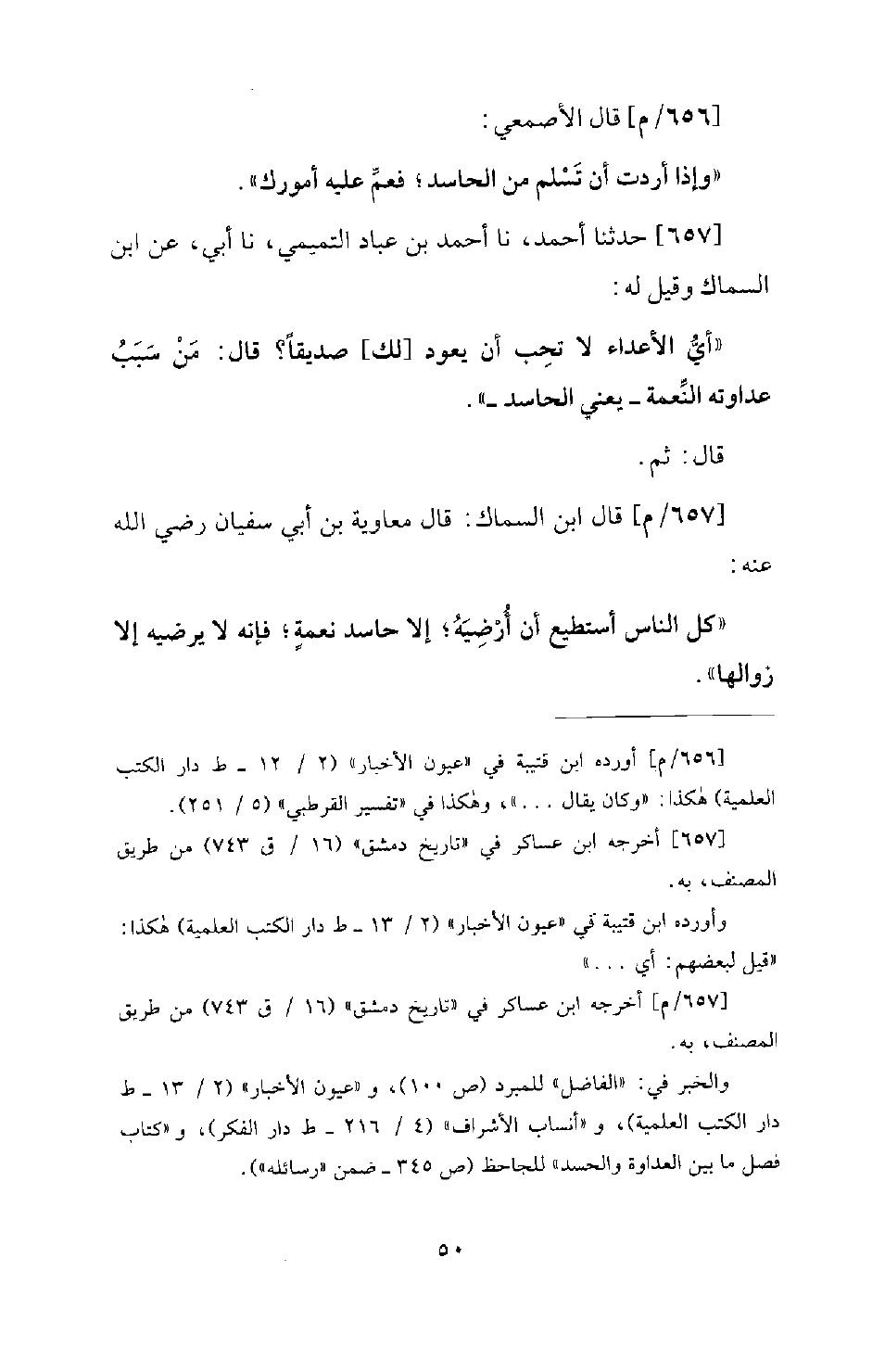 657 - / م - ثُمَّ قَالَ ابْنُ السَّمَّاكِ: قَالَ مُعَاوِيَةُ بْنُ أَبِي سُفْيَانَ رَضِيَ اللهِ عَنْهُ: كُلُّ النَّاسِ أَسْتَطِيعُ أَنْ أُرْضِيَهُ؛ إِلَّا حَاسِدَ نِعْمَةٍ؛ فَإِنَّهُ لَا يُرْضِيهِ إِلَّا زَوَالُهَا.
