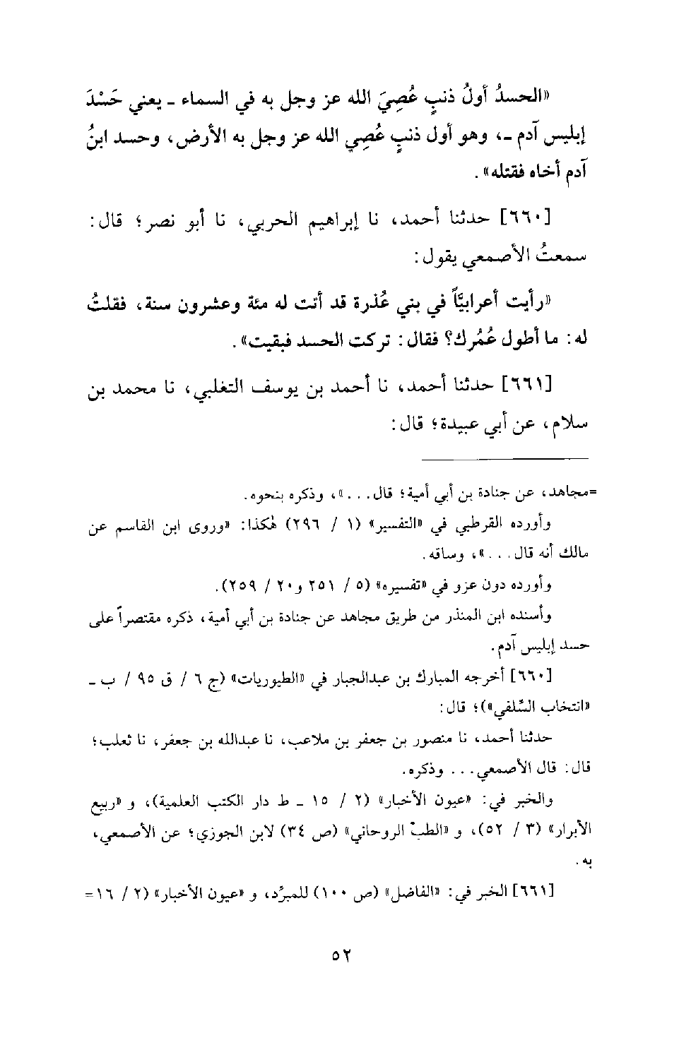 660 - حَدَّثَنَا أَحْمَدُ، نَا إِبْرَاهِيمُ الْحَرْبِيُّ، نَا أَبُو نَصْرٍ؛ قَالَ: سَمِعْتُ الْأَصْمَعِيَّ يَقُولُ: رَأَيْتُ أَعْرَابِيًّا فِي بَنِي عُذْرَةَ قَدْ أَتَتْ لَهُ مِئَةٌ وَعِشْرُونَ سَنَةً، فَقُلْتُ لَهُ: مَا أَطْوَلَ عُمُرِكَ؟ فَقَالَ: تَرَكْتُ الْحَسَدَ فَبَقِيتُ.