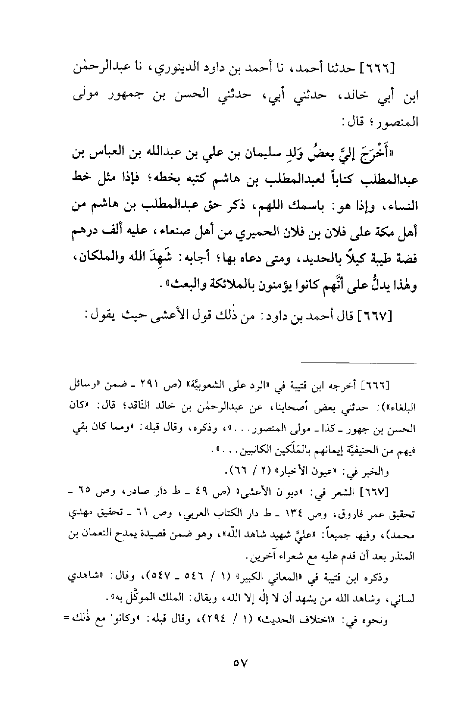 666 - حَدَّثَنَا أَحْمَدُ، نَا أَحْمَدُ بْنُ دَاوُدَ الدَّيْنَوَرِيُّ، نَا عَبْدُ الرَّحْمَنِ بْنُ أَبِي خَالِدٍ، حَدَّثَنِي أَبِي، حَدَّثَنِي الْحَسَنُ بْنُ جُمْهُورٍ مَوْلَى الْمَنْصُورِ؛ قَالَ: أَخْرَجَ إِلَيَّ بَعْضُ وَلَدِ سُلَيْمَانَ بْنِ عَلِيِّ بْنِ عَبْدِ اللهِ بْنِ الْعَبَّاسِ بْنِ عَبْدِ الْمُطَّلِبِ كِتَابًا لِعَبْدِ الْمُطَّلِبِ بْنِ هَاشِمٍ كَتَبَهُ بِخَطِّهِ؛ فَإِذَا مِثْلُ خَطِّ النِّسَاءِ، وَإِذَا هُوَ: بِاسْمِكَ اللهُمَّ، ذِكْرُ حَقِّ عَبْدِ الْمُطَّلِبِ بْنِ هَاشِمٍ مِنْ أَهْلِ مَكَّةَ عَلَى فُلَانِ بْنِ فُلَانٍ الْحِمْيَرِيِّ مِنْ أَهْلِ صَنْعَاءَ، عَلَيْهِ أَلْفُ دِرْهَمٍ فِضَّةٍ طَيِّبَةٍ كَيْلًا بِالْحَدِيدِ، وَمَتَى دَعَاهُ بِهَا؛ أَجَابَهُ؛ شَهِدَ اللهُ وَالْمَلَكَانِ. وَهَذَا يَدُلُّ عَلَى أَنَّهُمْ كَانُوا يُؤْمِنُونَ بِالْمَلَائِكَةِ وَالْبَعْثِ.