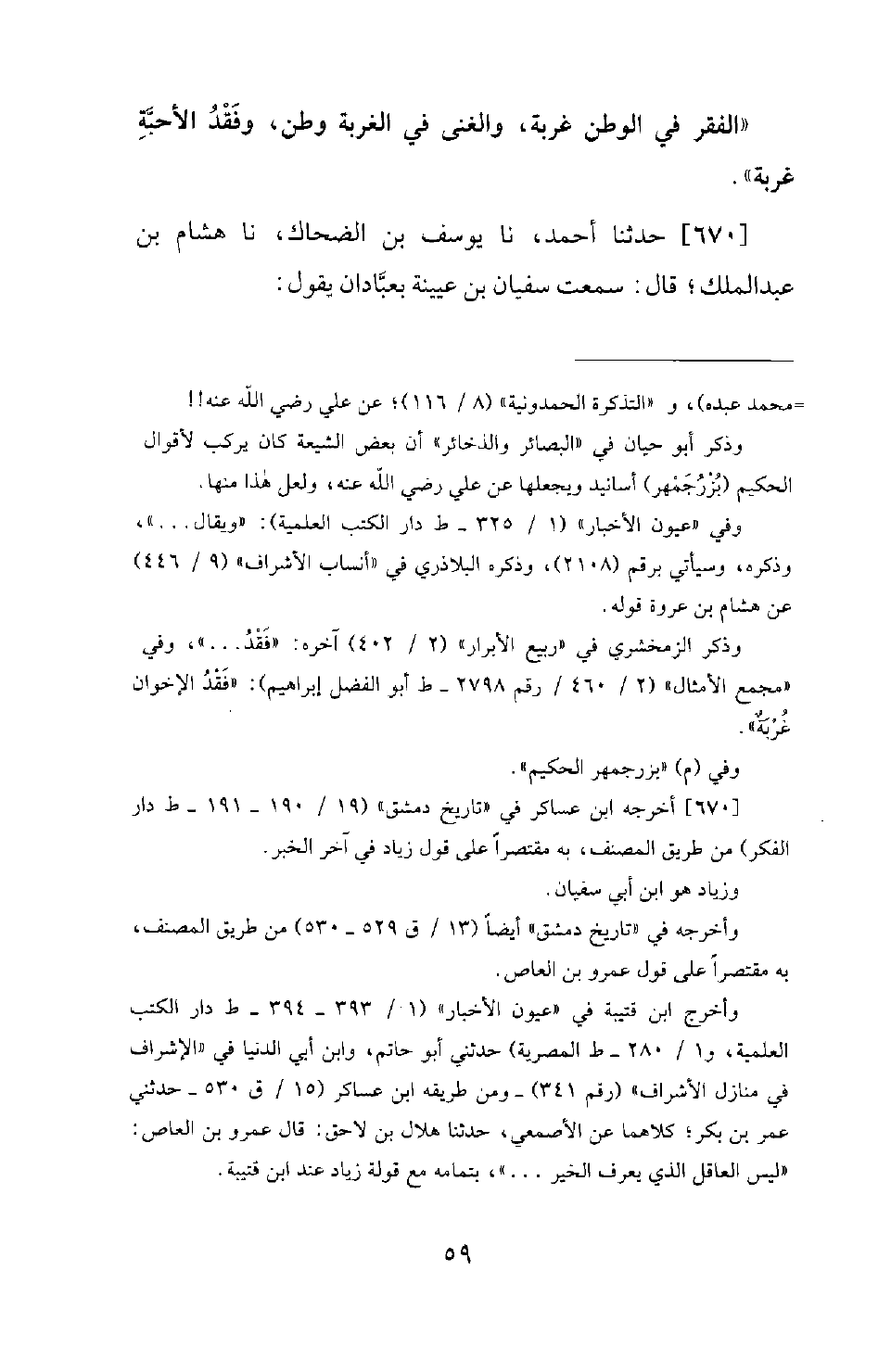 670 - حَدَّثَنَا أَحْمَدُ، نَا يُوسُفُ بْنُ الضَّحَّاكِ، نَا هِشَامُ بْنُ عَبْدِ الْمَلِكِ؛ قَالَ: سَمِعْتُ سُفْيَانَ بْنَ عُيَيْنَةَ بِعَبَّادَانَ يَقُولُ: -[60]- مَا رَأَيْتُ شَرَفًا قَطُّ؛ إِلَّا وَإِلَى جَانِبِهِ حَقٌّ مُضَيَّعٌ. قَالَ: قَالَ سُفْيَانُ: قَالَ عَمْرُو بْنُ الْعَاصِ: لَيْسَ الْعَاقِلُ الَّذِي يَعْرِفُ الْخَيْرَ مِنَ الشَّرِّ، وَلَكِنِ الْعَاقِلُ الَّذِي يَعْرِفُ خَيْرَ الشَّرَّيْنِ. قَالَ سُفْيَانُ: قَالَ زِيَادٌ: لَيْسَ الْعَاقِلُ الذي يحتال للأمر إِذَا وَقَعَ فِيهِ، وَلَكِنِ الْعَاقِلُ الَّذِي يَحْتَالُ لِلْأَمْرِ أَنْ لَا يَقَعَ فِيهِ.