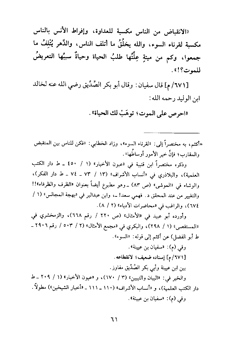 671 - / م - قَالَ سُفْيَانُ: وَقَالَ أَبُو بَكْرٍ الصِّدِّيقُ رَضِيَ اللهُ عَنْهُ لِخَالِدِ بْنِ الْوَلِيدِ رَحِمَهُ اللهُ: احْرِصْ عَلَى الْمَوْتِ؛ تُوهَبْ لَكَ الْحَيَاةُ