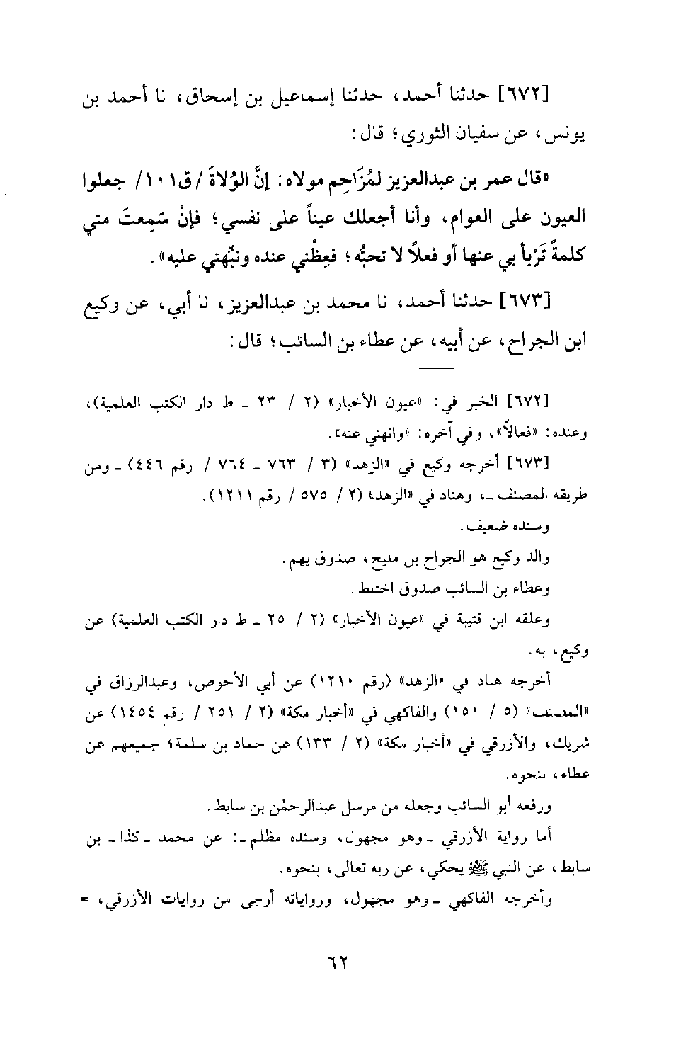 673 - حَدَّثَنَا أَحْمَدُ، نَا مُحَمَّدُ بْنُ عَبْدِ الْعَزِيزِ، نَا أَبِي، عَنْ وَكِيعِ بْنِ الْجَرَّاحِ، عَنْ أَبِيهِ، عَنْ عَطَاءِ بْنِ السَّائِبِ؛ قَالَ -[63]-: «قَدِمْتُ مِنْ مَكَّةَ، فَلَقِيَنِي الشَّعْبِيُّ، فَقَالَ: يَا أَبَا زَيْدٍ! أَطْرِفْنَا مِمَّا سَمِعْتَ بِمَكَّةَ؟ فَقُلْتُ: سَمِعْتُ عَبْدَ الرَّحْمَنِ بْنِ سَابِطٍ يَقُولُ: لَا يَسْكُنُ مَكَّةَ سَافِكُ دَمٍ، وَلَا آكِلُ رِبًا، وَلَا مَشَّاءٍ بِنَمِيمَةٍ. فَعَجِبْتُ مِنْهُ حِينَ عَدَلَ النَّمِيمَةَ بِسَفْكِ الدَّمِ وَأَكْلِ الرِّبَا. فَقَالَ الشَّعْبِيُّ: وَمَا يُعْجِبُكَ مِنْ هَذَا؟ ! وَهَلْ يُسْفَكُ الدَّمُ وَتُرْكَبُ الْعَظَائِمُ إِلَّا بِالنَّمِيمَةِ؟ !