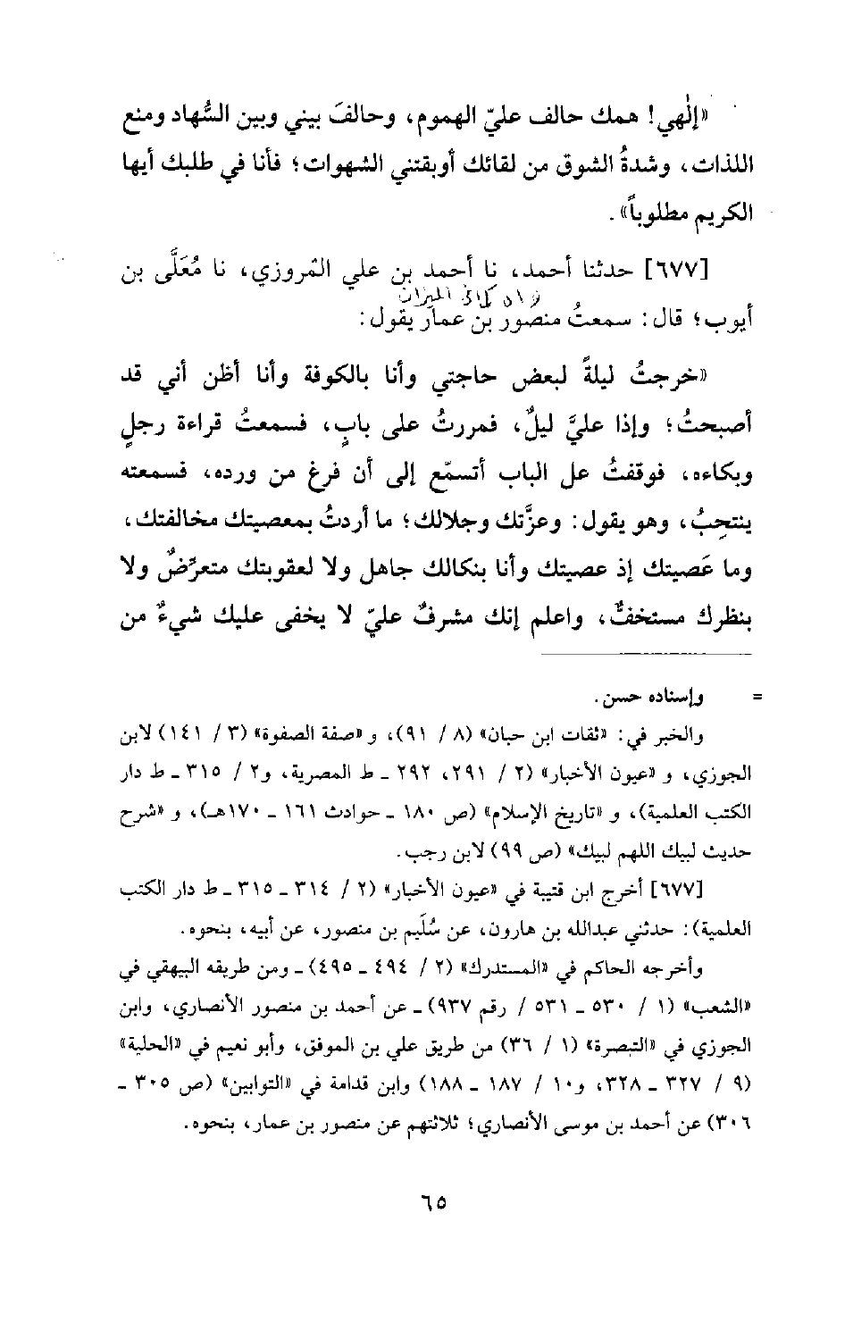 677 - حَدَّثَنَا أَحْمَدُ، نَا أَحْمَدُ بْنُ عَلِيِّ الْمَرْوَزِيُّ، نَا مُعَلَّى بْنُ أَيُّوبَ؛ قَالَ: سَمِعْتُ مَنْصُورَ بْنَ عَمَّارٍ يَقُولُ: «خَرَجْتُ لَيْلَةً لِبَعْضِ حَاجَتِي وَأَنَا بِالْكُوفَةِ، وَأَنَا أَظُنُّ أَنِّي قَدْ أَصْبَحْتُ؛ وَإِذَا عَلَيَّ لَيْلٌ، فَمَرَرْتُ عَلَى بَابٍ، فَسَمِعْتُ قِرَاءَةَ رَجُلٍ وَبُكَاءَهُ، فَوَقَفْتُ عَلَى الْبَابِ أَتَسَمَّعُ إِلَى أَنْ فَرَغَ مِنْ وِرْدِهِ، فسمعته ينتحِبُ، وهو يَقُولُ: وَعِزَّتِكَ وَجَلَالِكَ؛ ما أردتُ بمعصيتك مخالفتك، وما عَصيتك إذ عصيتك وأنا بنكالك جاهل، ولا لعقوبتك متعرِّضٌ، ولا بنظرك مستخفٍّ، وأعلم إنك مشرفٌ عليّ لَا يَخْفَى عَلَيْكَ شَيْءٌ مِنْ -[66]- خَلْقِكَ، وَلَكِنْ سَوَّلَتْ لِي نَفْسِي، وَأَعَانَتْنِي عَلَى ذَلِكَ شِقْوَتِي، وَغَرَّنِي سِتْرُكَ الْمَرْخِيُّ عَلَيَّ؛ فَعَصَيْتُكَ بِجَهْلٍ وَخَالَفْتُكَ بِجَهْلٍ؛ فَالْآنَ مِنْ عَذَابِكَ مَنْ يَسْتَنْقِذُنِي؟ ! وَبِحَبْلِ مَنْ أَعْتَصِمُ إِنْ قَطَعْتَ حَبْلَكَ عَنِّي؟ ! فَوَاسَوأتَاهُ مِنَ الْوُقُوفِ بَيْنَ يَدَيْكَ غَدًا إِذَا قِيلَ لِلْمُخِفِّينَ جُوزُوا وَلِلْمُثْقِلِينَ حُطُّوا؛ أَفَمَعَ الْمُثْقِلِينَ أَحُطُّ أَمْ مَعَ الْمُخِفِّينَ أَجُوزُ؟ ! وَيْلِي! ! كُلَّمَا كَبِرَتْ سِنِّي كَثُرَتْ ذُنُوبِي، وَيْلِي! ! كُلَّمَا طَالَ عُمْرِي كَثُرَتْ مَعَاصِيَّ؛ فَمِنْ كَمْ أَتُوبُ وَفِي كَمْ أَعُودُ؟ ! أَمَا آنَ لِي أَنْ أَسْتَحْيِيَ مِنْ رَبِّي؟ ! قَالَ مَنْصُورٌ: فَغُشِيَ عَلَيَّ مِنْ سَاعَتِي «