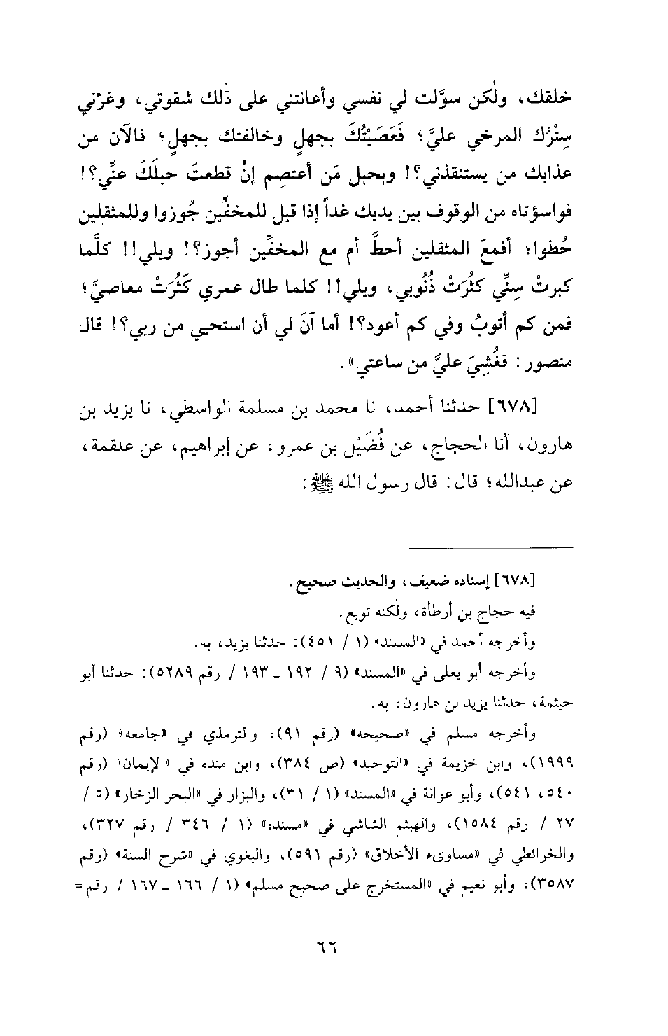 678 - حَدَّثَنَا أَحْمَدُ، نَا مُحَمَّدُ بْنُ مَسْلَمَةَ الْوَاسِطِيُّ، نَا يَزِيدُ بْنُ هَارُونَ، أَنَا الْحَجَّاجُ، عَنْ فُضَيْلِ بْنِ عَمْرٍو، عَنْ إِبْرَاهِيمَ، عَنْ عَلْقَمَةَ، عَنْ عَبْدِ اللهِ؛ قَالَ: قَالَ رَسُولُ اللهِ -[67]- صَلَّى اللَّهُ عَلَيْهِ وَسَلَّمَ: «لَا يَدْخُلُ الْجَنَّةَ مَنْ كَانَ فِي قَلْبِهِ مِثْقَالُ حَبَّةٍ مِنْ خَرْدَلٍ مِنْ كِبْرٍ»