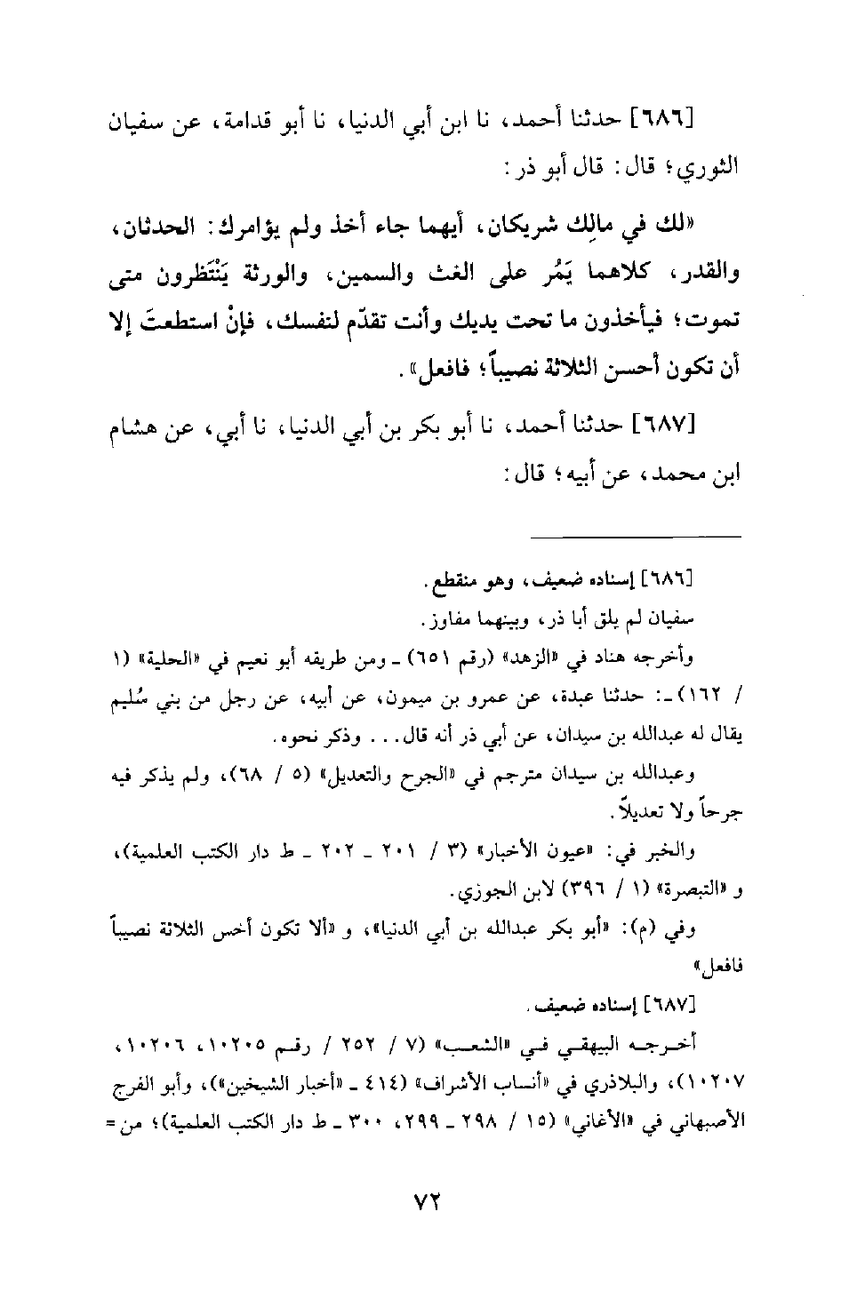 686 - حَدَّثَنَا أَحْمَدُ، نَا ابْنُ أَبِي الدُّنْيَا، نَا أَبُو قُدَامَةَ، عَنْ سُفْيَانَ الثَّوْرِيِّ؛ قَالَ: قَالَ أَبُو ذَرٍّ: لَكَ فِي مَالِكَ شَرِيكَانِ، أَيُّهُمَا جَاءَ أَخَذَ وَلَمْ يُؤَامِرْكَ: الْحَدَثَانِ، وَالْقَدَرُ، كِلَاهُمَا يَمُرُّ عَلَى الْغَثِّ وَالسَّمِينِ، وَالْوَرَثَةُ يَنْتَظِرُونَ مَتَى تَمُوتُ؛ فَيَأْخُذُونَ مَا تَحْتَ يَدَيْكَ، وَأَنْتَ تُقَدِّمُ لِنَفْسِكَ، فَإِنِ اسْتَطَعْتَ إِلَّا أَنْ تَكُونَ أَحْسَنَ الثَّلَاثَةِ نَصِيبًا؛ فَافْعَلْ