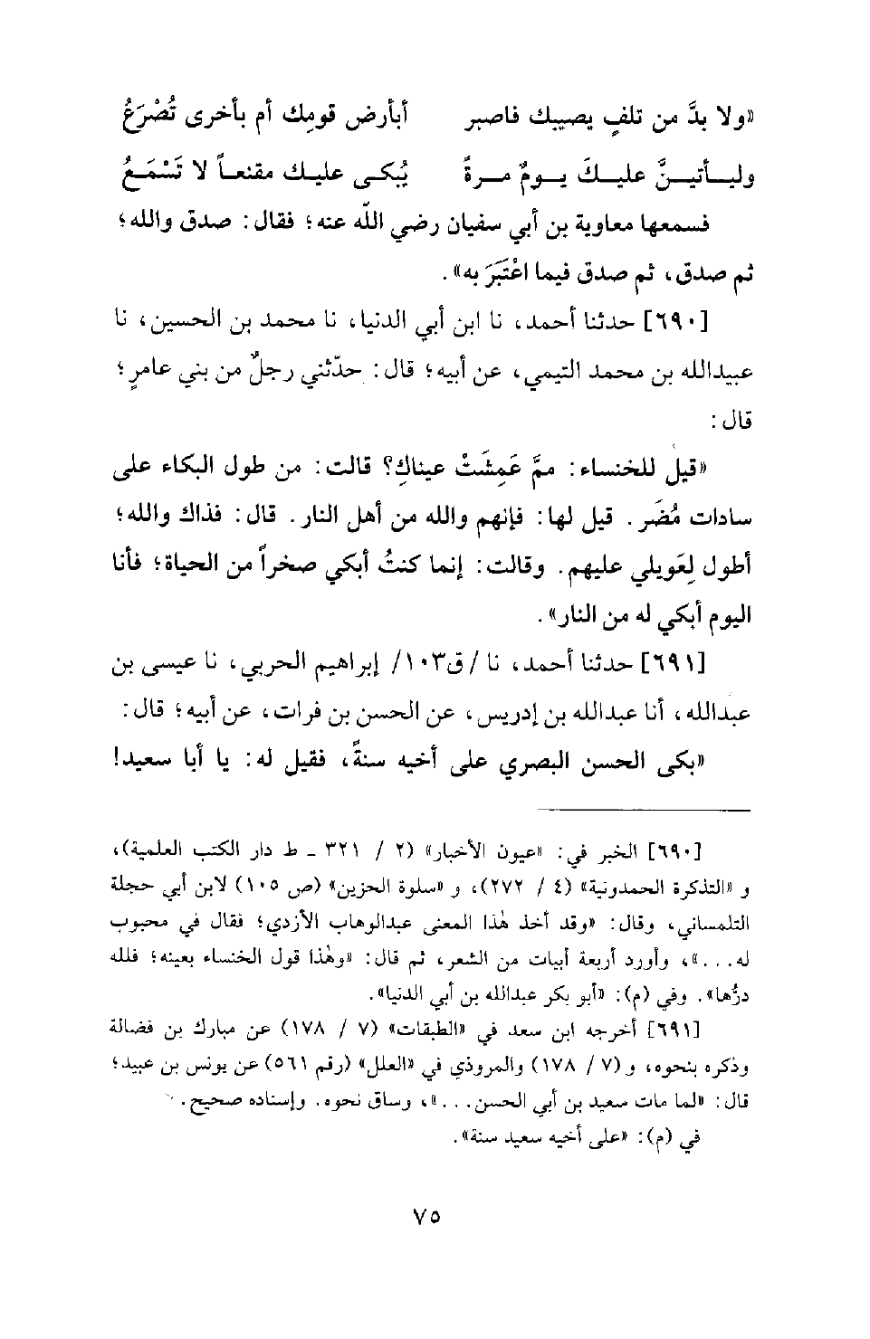 690 - حَدَّثَنَا أَحْمَدُ، نَا ابْنُ أَبِي الدُّنْيَا، نَا مُحَمَّدُ بْنُ الْحُسَيْنِ، نَا عُبَيْدُ اللهِ بْنُ محمد التيمي، عَنْ أَبِيهِ؛ قَالَ: حَدَّثَنِي رَجُلٌ مِنْ بَنِي عَامِرٍ؛ قَالَ: قِيلَ لِلْخَنْسَاءِ: مِمَّ عَمِشَتْ عَيْنَاكِ؟ قَالَتْ: مِنْ طُولِ الْبُكَاءِ عَلَى سَادَاتِ مُضَرَ. قِيلَ لَهَا: فَإِنَّهُمْ وَاللهِ مِنْ أَهْلِ النَّارِ. قَالَتْ: فَذَاكَ وَاللهِ؛ أَطْوَلُ لِعَوِيلِي عَلَيْهِمْ. وَقَالَتْ: إِنَّمَا كُنْتُ أَبْكِي صَخْرًا مِنَ الْحَيَاةِ؛ فَأَنَا الْيَوْمَ أَبْكِي لَهُ مِنَ النَّارِ.