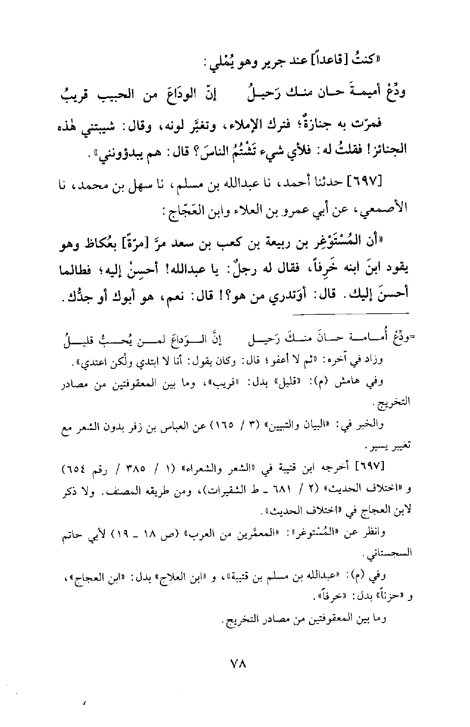 697 - حَدَّثَنَا أَحْمَدُ، نَا عَبْدُ اللهِ بْنُ مُسْلِمٍ، نَا سَهْلُ بْنُ مُحَمَّدٍ، نَا الْأَصْمَعِيُّ، عَنْ أَبِي عَمْرِو بْنِ الْعَلَاءِ وَابْنِ الْعَجَّاجِ: أن الْمُسْتَوْغِرَ بْنَ رَبِيعَةَ بْنِ كَعْبِ بْنِ سَعْدٍ مَرَّ [مَرَّةً] بِعُكَاظٍ وَهُوَ يَقُودُ ابْنَ ابْنِهِ خَرِفاً، فَقَالَ لَهُ رَجُلٌ: يَا عَبْدَ اللهِ! أَحْسِنْ إِلَيْهِ؛ فَطَالَمَا أَحْسَنَ إليك. قَالَ: أوَ تدري مَنْ هُوَ؟ ! قَالَ: نَعَمْ، هُوَ أَبُوكَ أَوْ جَدُّكَ. -[79]- قَالَ: هُوَ وَاللهِ ابْنُ ابْنِي. فَقَالَ الرَّجُلُ: لَمْ أَرَ كَالْيَوْمِ قَطُّ فِي الْكَذِبِ، وَلَا مُسْتَوْغِرَ بْنَ رَبِيعَةَ! قال: فأنا مُسْتَوغِرِ بن ربيعة. قَالَ أَبُو عَمْرِو بْنُ الْعَلَاءِ: وَعَاشَ الْمُسْتَوغِرُ ثَلَاثَ مِئَةٍ وَعِشْرِينَ سَنَةً.