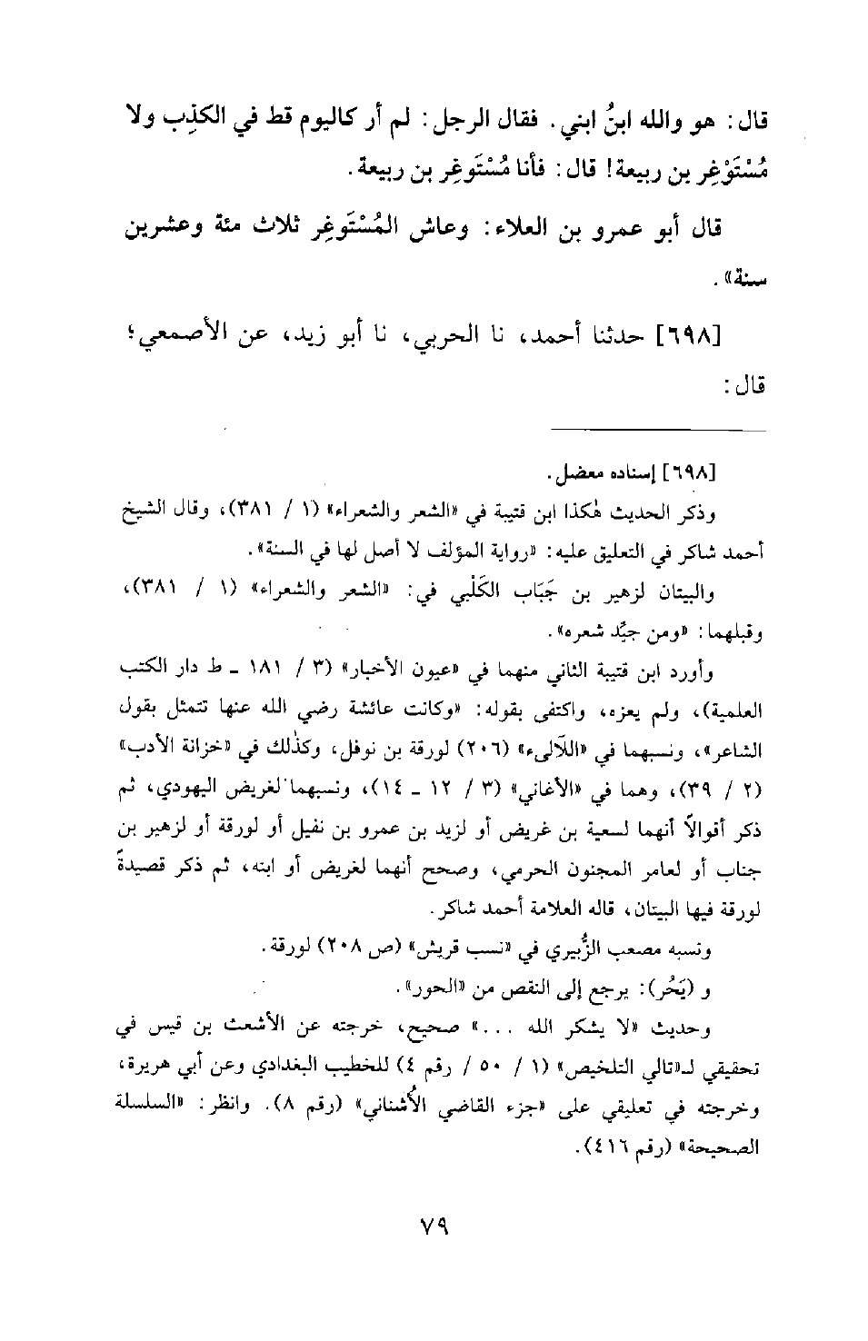 698 - حَدَّثَنَا أَحْمَدُ، نَا الْحَرْبِيُّ، نَا أَبُو زَيْدٍ، عَنِ الْأَصْمَعِيِّ؛ قَالَ -[80]-: «سَمِعَ النَّبِيُّ صَلَّى اللَّهُ عَلَيْهِ وَسَلَّمَ عَائِشَةَ رَضِيَ اللهُ عَنْهَا وَهِيَ تَمَثَّلُ بِقَوْلِ زُهَيْرِ بْنِ جَنَابٍ الْكَلْبِيِّ: