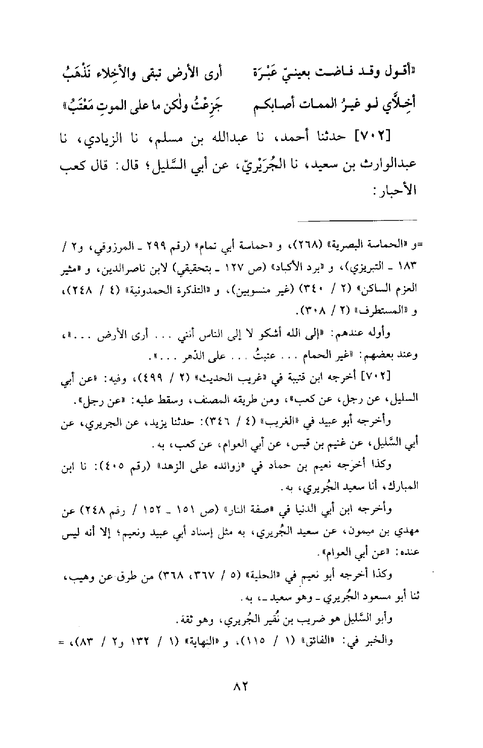 702 - حَدَّثَنَا أَحْمَدُ، نَا عَبْدُ اللهِ بْنُ مُسْلِمٍ، نَا الزِّيَادِيُّ، نَا عَبْدُ الْوَارِثِ بْنُ سَعِيدٍ، نَا الْجُرَيْرِيُّ، عَنْ أَبِي السَّلِيلِ؛ قَالَ: قَالَ كَعْبُ الْأَحْبَارِ: -[83]- تَمَسَّكُ النَّارُ يَوْمَ الْقِيَامَةِ حَتَّى تَبُصَّ كَأَنَّهَا مَتْنُ إِهَالَةٍ، فَإِذَا اسْتَوَى عَلَيْهَا الْخَلَائِقُ؛ نَادَى مُنَادٍ: أَمْسِكِي أَصْحَابَكِ، وَدَعِي أَصْحَابِي. فَتَخْنِسُ بِهِمْ، فَيَخْرُجُ بها الْمُؤْمِنُونَ. قَالَ أَبُو مُحَمَّدٍ: تَبُصُّ؛ أَيْ: تَبْرُقُ. وَقَوْلُهُ: مَتْنُ إِهَالَةٍ؛ فَالْإِهَالَةُ: الدَّسَمُ. وَقَوْلُهُ: تَخْنِسُ بِهِمْ؛ أَيْ: تَخْذُلُهُمْ وَتَتَأَخَّرُ كَمَا تَخْنِسُ النُّجُومُ.