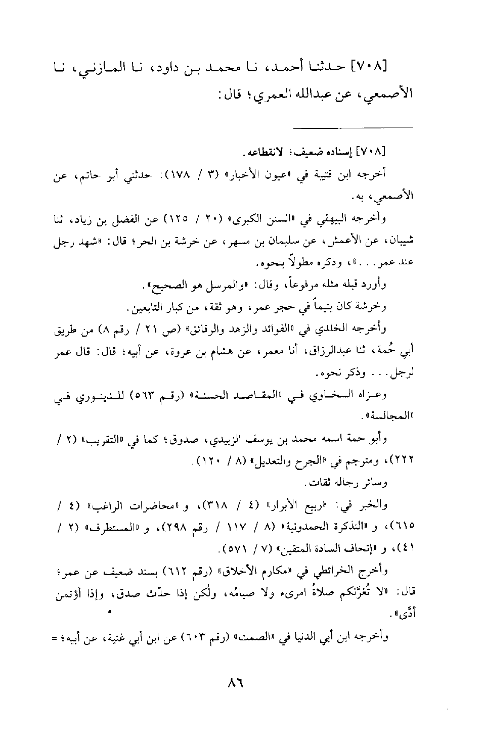 708 - حَدَّثَنَا أَحْمَدُ، نَا مُحَمَّدُ بْنُ داود، نا المازني، نَا الْأَصْمَعِيُّ، عَنْ عَبْدِ اللهِ الْعُمَرِيِّ؛ قَالَ: -[87]- قَالَ رَجُلٌ لِعُمَرَ بْنِ الْخَطَّابِ رَضِيَ اللهُ عَنْهُ: إِنَّ فُلَانًا رَجُلُ صِدْقٍ. فَقَالَ لَهُ عُمَرُ: هَلْ سَافَرْتَ مَعَهُ؟ قَالَ: لَا. قَالَ: فهل كان بَيْنَكَ وَبَيْنَهُ مُعَامَلَةٌ؟ قَالَ: لَا. قَالَ: فَهَلِ ائْتَمَنْتَهُ عَلَى شَيْءٍ؟ قَالَ: لَا. قَالَ: فَأَنْتَ الَّذِي لَا عِلْمَ لَكَ بِهِ، أَرَاكَ رَأَيْتَهُ يَرْفَعُ رَأْسَهُ وَيَخْفِضُهُ فِي الْمَسْجِدِ