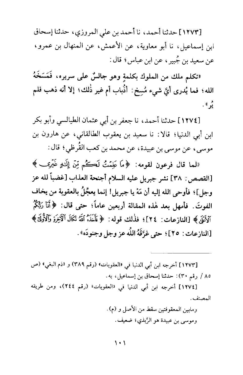 1274 - حَدَّثَنَا أَحْمَدُ، نَا جَعْفَرُ بْنُ أَبِي عُثْمَانَ الطَّيَالِسِيُّ وَأَبُو بَكْرِ بن أبي الدنيا؛ نَا سَعِيدُ بْنُ يَعْقُوبَ الطَّالْقَانِيُّ، عَنْ هَارُونَ بْنِ مُوسَى، عَنْ مُوسَى بْنِ عُبَيْدَةَ، عَنْ مُحَمَّدِ بْنِ كَعْبٍ الْقَرَظِيِّ؛ قَالَ: لَمَّا قَالَ فِرْعَوْنُ لِقَوْمِهِ: {مَا عَلِمْتُ لَكُمْ مِنْ إِلَهٍ غيري} [القصص: 38] نَشَرَ جِبْرِيلُ عَلَيْهِ السَّلامُ أَجْنِحَةَ الْعَذَابِ [غَضَبًا لِلَّهِ عَزَّ وَجَلَّ] ؛ فَأَوْحَى اللهُ إِلَيْهِ: أَنْ مَهْ يَا جِبْرِيلُ! إِنَّمَا يُعَجِّلُ بِالْعُقُوبَةِ مَنْ يَخَافُ الْفَوْتَ. فَأُمْهِلَ بَعْدَ هَذِهِ الْمَقَالَةِ أَرْبَعِينَ عَامًا؛ حَتَّى قَالَ (أَنَا رَبُّكُمُ الأَعْلَى) [النازعات: 24] ؛ فَذَلِكَ قَوْلُهُ: (فَأَخَذَهُ اللهُ نَكَالَ الآخِرَةِ والأُولَى (25)) [النازعات: 25] ؛ حَتَّى غَرَّقَهُ اللهُ عَزَّ وَجَلَّ وَجُنُودَهُ
