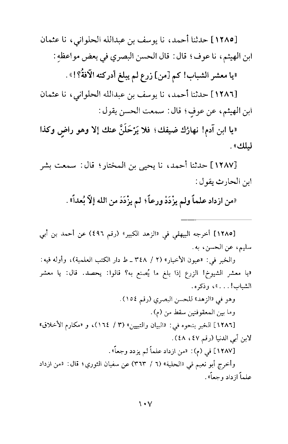 1285 - حَدَّثَنَا أَحْمَدُ، نَا يُوسُفُ بْنُ عَبْدِ اللهِ الْحُلْوَانِيُّ، نَا عُثْمَانُ بْنُ الْهَيْثَمِ، نَا عَوْفٌ؛ قَالَ: قَالَ الْحَسَنُ الْبَصْرِيُّ فِي بَعْضِ مَوَاعِظِهِ: يَا مَعْشَرَ الشَّبَابِ! كَمْ مِنْ زَرْعٍ لَمْ يَبْلُغْ أَدْرَكَتْهُ الْآفَةُ؟ !