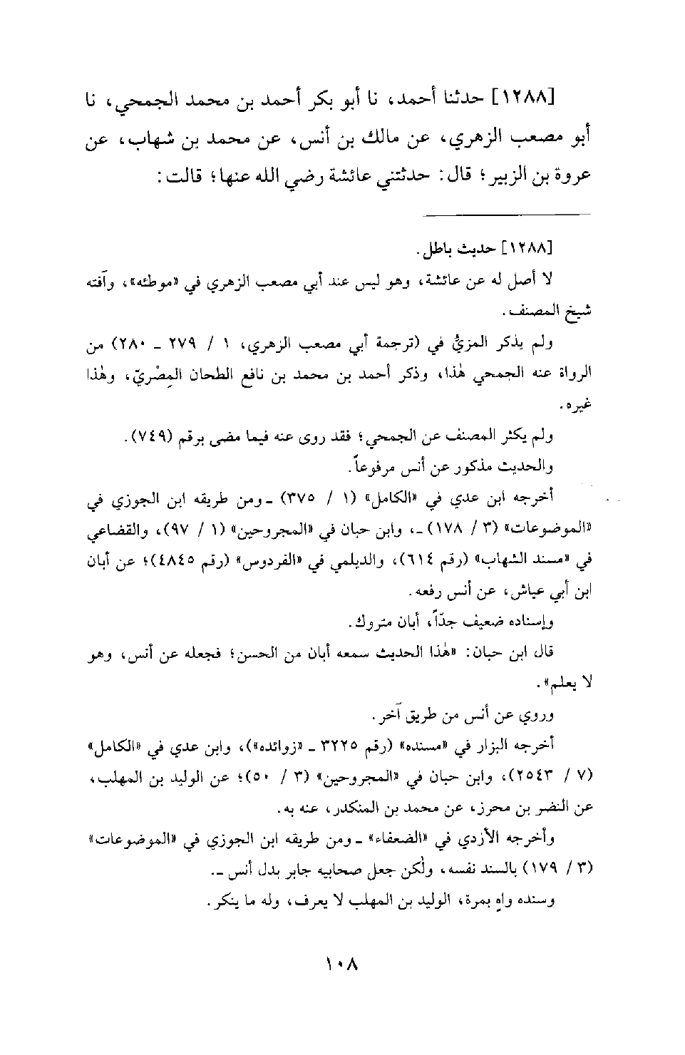 1288 - حَدَّثَنَا أَحْمَدُ، نَا أَبُو بَكْرٍ أَحْمَدُ بْنُ مُحَمَّدٍ الْجُمَحِيُّ، نَا أَبُو مُصْعَبٍ الزُّهْرِيُّ، عَنْ مَالِكِ بْنِ أَنَسٍ، عَنْ مُحَمَّدِ بْنِ شِهَابٍ، عَنْ عُرْوَةَ بْنِ الزُّبَيْرِ؛ قَالَ: حَدَّثَتْنِي عَائِشَةُ رَضِيَ اللهُ عَنْهَا؛ قَالَتْ: -[111]- خَطَبَنَا رَسُولُ اللهِ صَلَّى اللَّهُ عَلَيْهِ وَسَلَّمَ عَلَى نَاقَتِهِ الْجَدْعَاءِ وَلَيْسَتِ الْعَضْبَاءَ، فَقَالَ: «أَيُّهَا النَّاسُ! كَأَنَّ الْمَوْتَ فِيهَا عَلَى غَيْرِنَا كُتِبَ، وَكَأَنَّ الْحَقَّ فِيهَا عَلَى غَيْرِنَا وَجَبَ، وَكَأَنَّ الَّذِينَ نُشَيِّعُ مِنَ الْأَمْوَاتِ سَفْرٌ، عَمَّا قَلِيلٌ إِلَيْنَا رَاجِعُونَ، نُبَوِّئُهُمْ أَجْدَاثَهُمْ، وَنَأْكُلُ تُرَاثَهُمْ، كَأَنَّا مُخَلَّدُونَ بَعْدَهُمْ، قَدْ نَسِينَا كُلَّ وَاعِظَةٍ، وَأَمِنَّا كُلَّ جَائِحَةٍ، طُوبَى لِمَنْ شَغَلَهُ عَيْبُهُ عَنْ عُيُوبِ النَّاسِ، وَأَنْفَقَ مِنْ مَالٍ اكْتَسَبَهُ مِنْ غَيْرِ مَعْصِيَةٍ، وَخَالَطَ أَهْلَ الذُّلِّ وَالْمَسْكَنَةِ، وَقَارَبَ أَهْلَ الْفِقْهِ وَالْحِكْمَةِ، وَوَسِعَتْهُ السُّنَّةُ، وَلَمْ يَعْدُ إلى بدعة « [خبر باطل] .