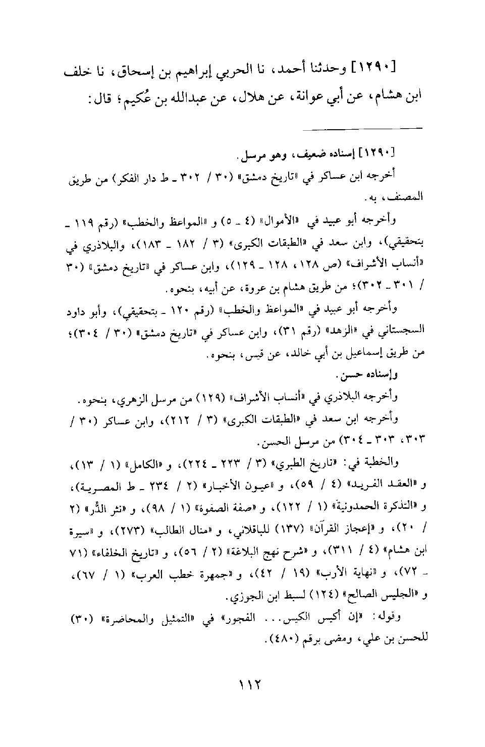 1290 - وَحَدَّثَنَا أَحْمَدُ، نَا الْحَرْبِيُّ إِبْرَاهِيمُ بْنُ إِسْحَاقَ، نَا خَلَفُ بْنُ هِشَامٍ، عَنْ أَبِي عَوَانَةَ، عَنْ هِلالٍ، عَنْ عَبْدِ اللهِ بْنِ عُكَيْمٍ؛ قَالَ: -[113]- لَمَّا بُويِعَ أَبُو بَكْرٍ رَضِيَ اللهُ عَنْهُ صَعَدَ الْمِنْبَرَ، فَنَزَلَ مِرْقَاةً مِنْ مَقْعَدِ النَّبِيِّ صَلَّى اللَّهُ عَلَيْهِ وَسَلَّمَ، فَحَمَدَ اللهَ وَأَثْنَى عَلَيْهِ، ثُمَّ قَالَ: اعْلَمُوا أَيُّهَا النَّاسُ أَنَّ أَكْيَسَ الْكَيْسِ التُّقَى، وأن أَحْمَقَ الْحُمْقِ الْفُجُورُ، وَإِنَّ أَقْوَاكُمْ عِنْدِي الضَّعِيفُ حَتَّى آخُذَ لَهُ بِحَقِّهِ، وَإِنَّ أَضْعَفَكُمْ عِنْدِي الْقَوِيُّ حَتَّى آخُذَ الْحَقَّ مِنْهُ، إِنَّمَا أَنَا مُتَّبِعٌ وَلَسْتُ بِمُبْتَدِعٍ، فَإِنْ أَحْسَنْتُ؛ فَأَعِينُونِي، وَإِنْ زِغْتُ؛ فَقَوِّمُونِي، وَحَاسِبُوا أَنْفُسَكُمْ قَبْلَ أَنْ تُحَاسَبُوا، وَلا يَدَعُ قَوْمٌ الْجِهَادَ فِي سَبِيلِ اللهِ؛ إِلَّا ضَرَبَهُمُ اللهُ بِالْفَقْرِ، وَلا ظَهَرَتِ الْفَاحِشَةُ فِي قَوْمٍ؛ إِلَّا عَمَّهُمُ اللهُ عَزَّ وَجَلَّ بِالْبَلاءِ؛ فَأَطِيعُونِي مَا أَطَعْتُ اللهَ وَرَسُولَهُ، فَإِذَا عَصَيْتُ اللهَ وَرَسُولَهُ؛ فَلا طَاعَةَ لِي عَلَيْكُمْ، أَقُولُ قَوْلِي هَذَا وَأَسْتَغْفِرُ اللهَ لِي وَلَكُمْ